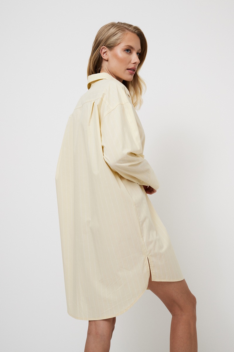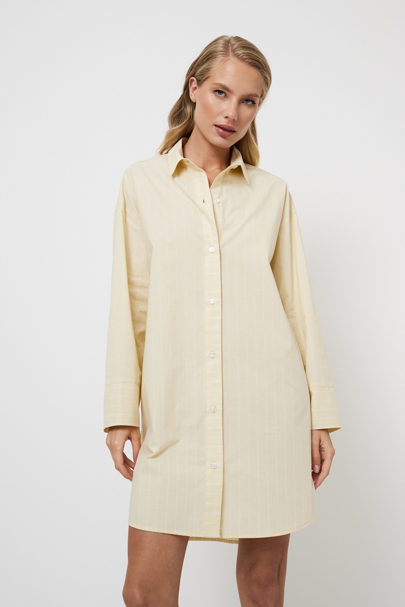 Представляем вашему вниманию сорочку Limonella, идеально подходящую для отдыха дома или на пляже. Изготовлена из лёгкого хлопка, жизнерадостного жёлтого цвета, который украсит ваш гардероб, а игривые белые полоски придадут уникальный вид. Сорочка с длинными рукавами на пуговицах, имеет классический воротник и закруглённый низ, которые придают ей неподвластную времени элегантность. Независимо от того, отдыхаете ли вы в гостиной или греетесь на солнце у берега, сорочка Limonella придаст вам жизнерадостный и утончённый вид.