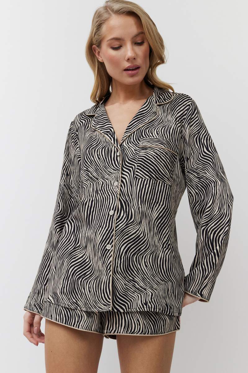 Пижама женская с шортами LINNA для вашего ночного комфорта. Пижама выполнена из вискозы с легким эластаном, с животным принтом. Рубашка на пуговицах, с длинными рукавами, отложным воротником и нагрудным карманом. Окантовка дополняет и украшает комплект. Шорты свободные, с эластичным поясом с завязкой. Расслабьтесь с максимальным комфортом и стилем в пижаме LINNA.