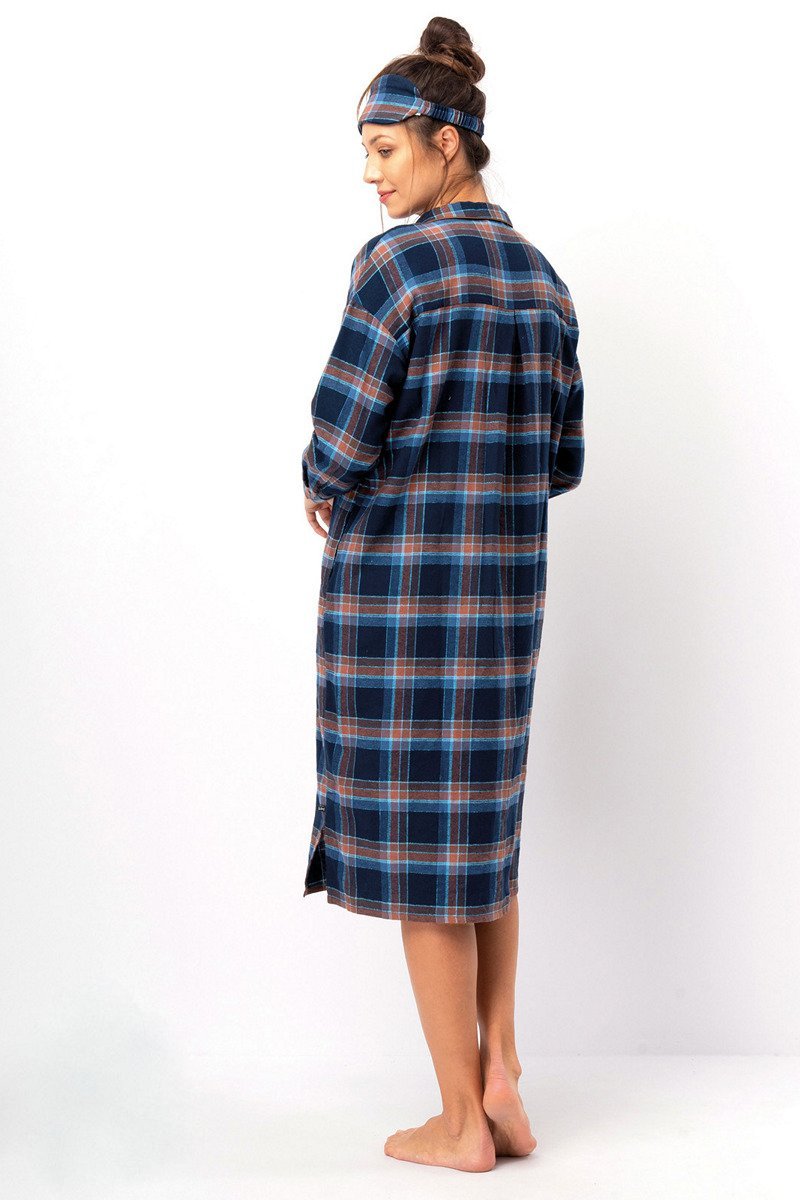 Расстегивающаяся ночная сорочка с классическим воротником имеет очень удобный крой — спущенное плечо и складка на спине обеспечивают большую свободу во время сна. Удлиненная модель длиной до колена (длина 114 см для размера M) обеспечивает тепло, а боковые разрезы обеспечивают полную свободу движений. Благодаря пуговицам по всей длине его можно носить как теплую накидку. Незаметные и очень практичные карманы по бокам. Очаровательный декоративный карман на груди. Рукав с элегантной манжетой. Нежная и легкая фланелевая ткань согреет ваше тело холодными вечерами. Высококачественные 100% хлопковые волокна в сочетании с соответствующими швами и нитками обеспечивают прочность и длительный срок службы. Прекрасное сочетание глубокого темно-синего и шоколадно-коричневого цветов подарит вам и вашему телу отличное настроение. Очаровательная блестящая нить придает пижаме неповторимый штрих.