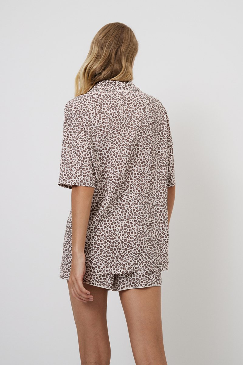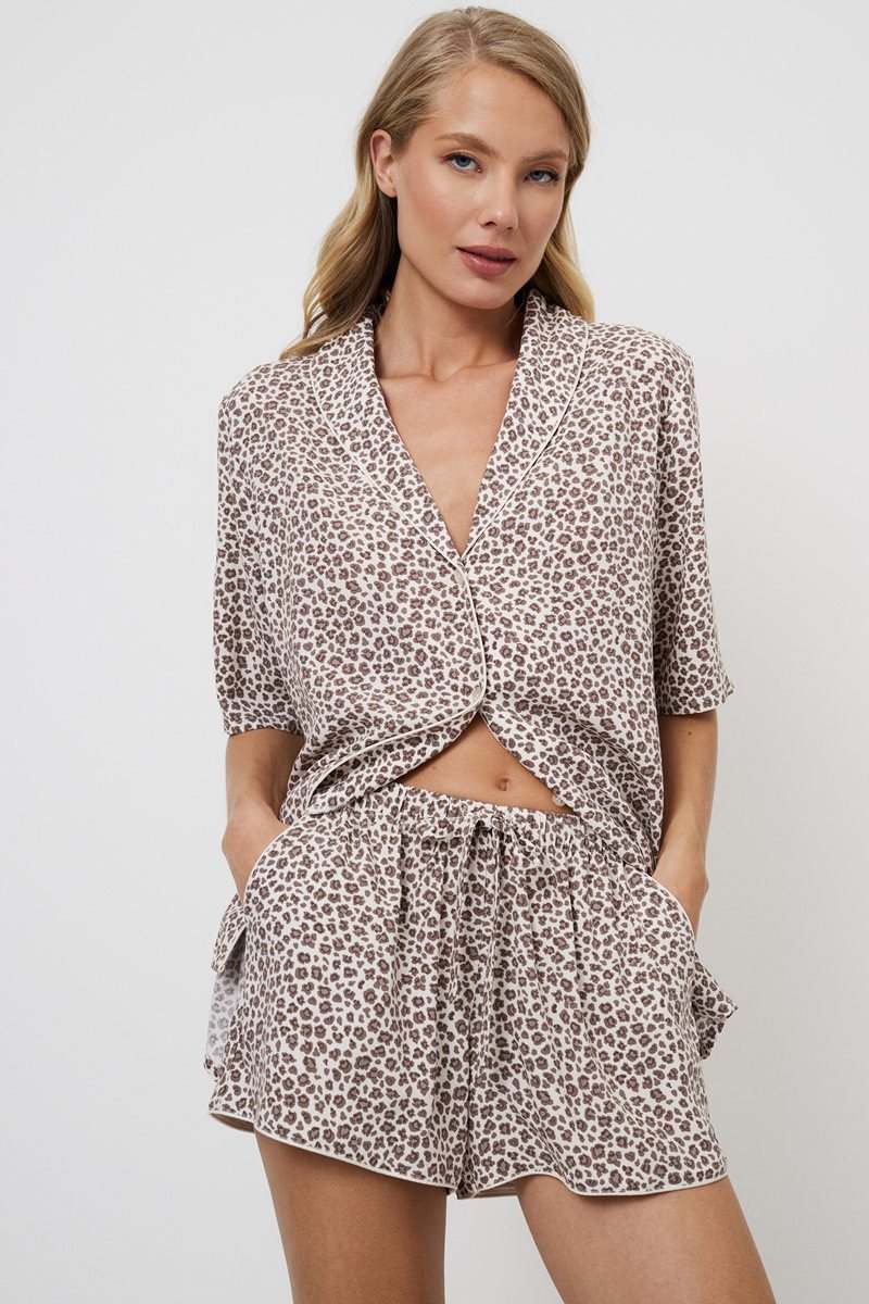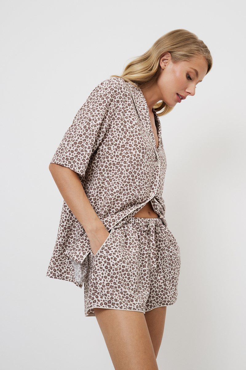 Представляем вашему вниманию нашу потрясающую укороченную пижаму Lumielle, в которой комфорт сочетается со стилем и лёгким очарованием. Изготовленная из лёгкой вискозы с леопардовым принтом, она станет украшением вашей коллекции домашней одежды. Рубашка на пуговицах с короткими рукавами и округлым V-образным вырезом украшен окантовкой. Шорты с практичными карманами, поясом-бантом для регулировки по фигуре и отделкой из канта на карманах и внизу. Комплект не только функционален, но и моден. Наденьте пижаму с шортами Lumielle и раскройте свою дикую сторону стильно и комфортно.