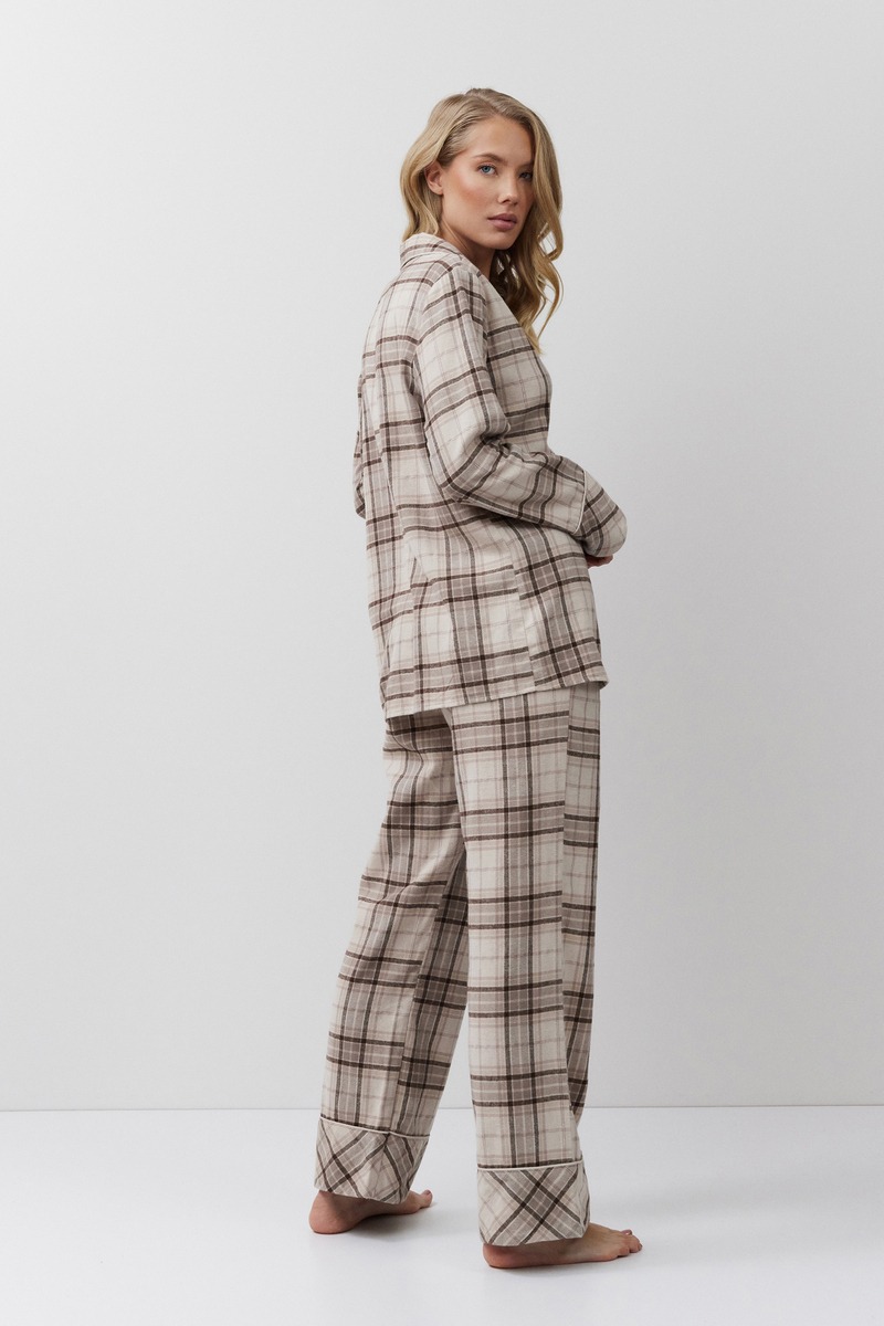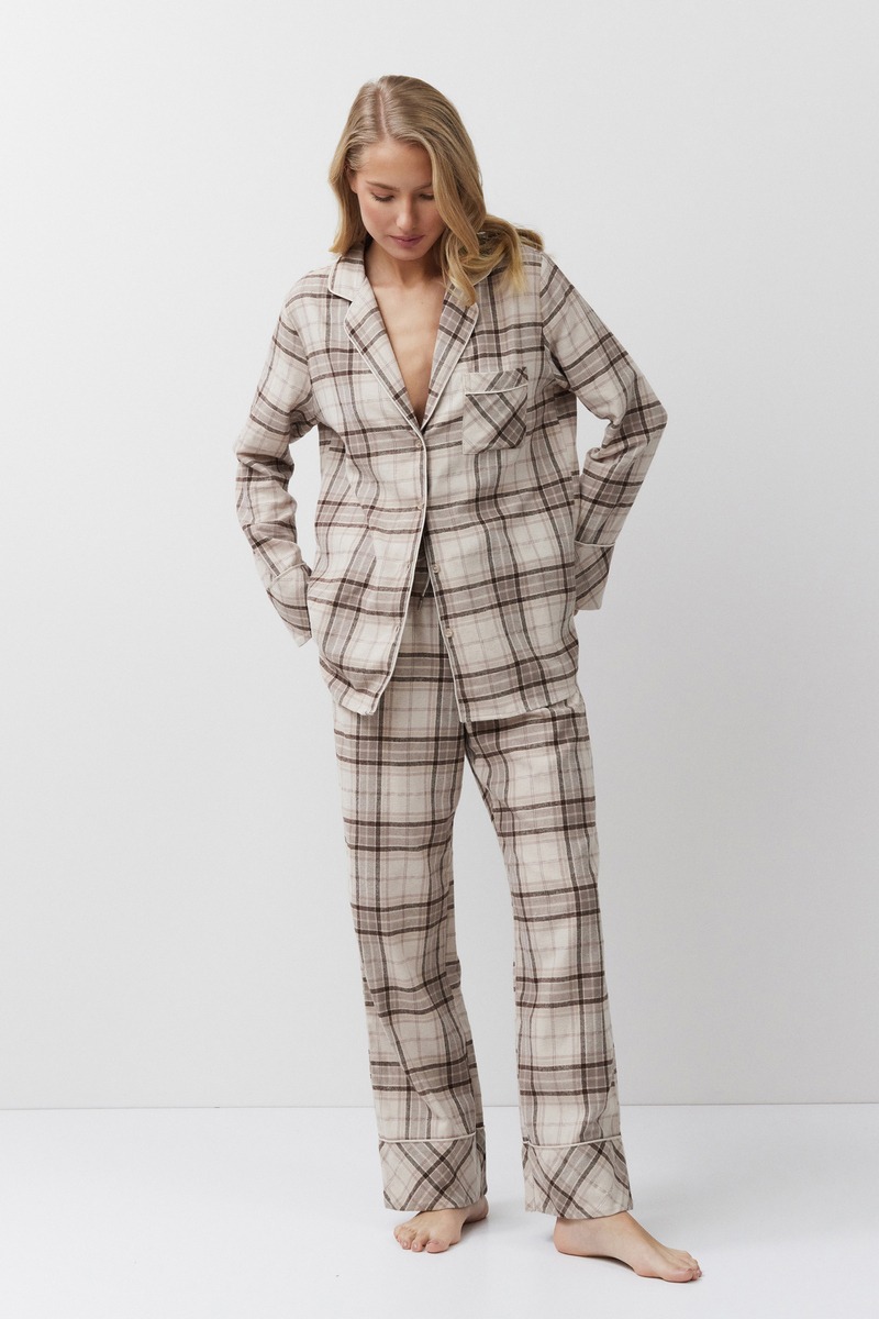 Пижама женская со штанами MAELLE для вашего ночного комфорта. Пижама изготовлена из фланелевого хлопка с принтом в клетку. Рубашка на пуговицах, с длинными рукавами, отложным воротником и нагрудным карманом. Окантовка дополняет и украшает комплект. Штаны свободные, с эластичным поясом с завязкой. Расслабьтесь с максимальным комфортом и стилем в пижаме MAELLE.