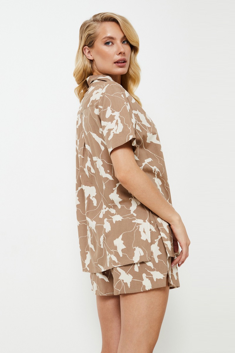 Окунитесь в мир комфорта с этой дышащей пижамой из хлопка и вискозы. Комплект украшен очаровательным абстрактным мотивом в нежных карамельных и молочно-сливочных тонах, создающим успокаивающую визуальную палитру. Элегантно застегнутая рубашка с острым воротником и короткими рукавами является свидетельством непринужденной утонченности. Ансамбль дополняют шорты в тон, которые обещают легкость благодаря эластичному поясу. А для придания изюминки вышитая эмблема спереди шорт жизнерадостно приглашает вас "УСТРОИТЬСЯ ПОУДОБНЕЕ", воплощая суть расслабления в этом шикарном комплекте пижамы.