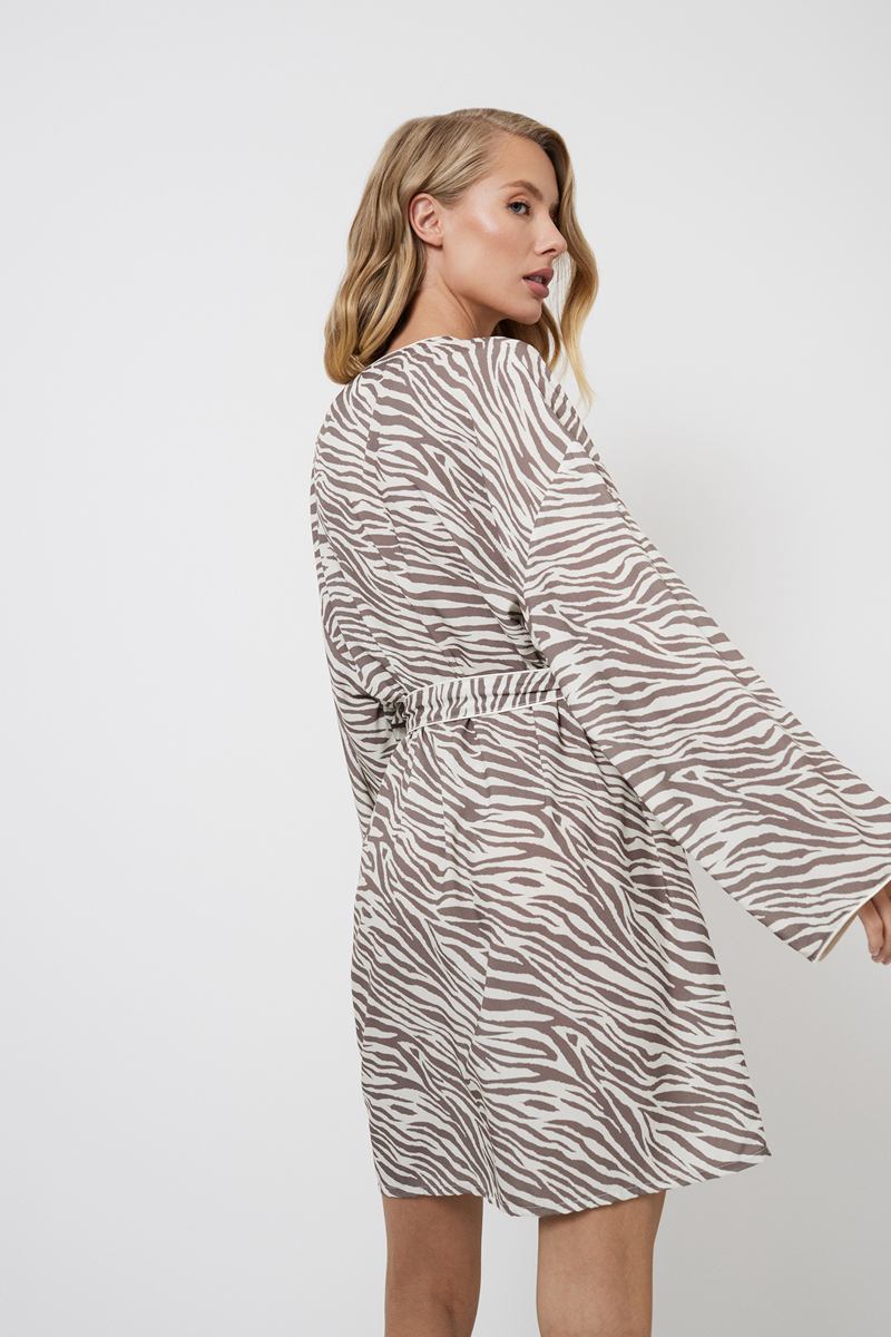 Представляем вам халат Manuela, в котором комфорт сочетается с экзотическим очарованием благодаря лёгкому материалу из вискозы. Халат с длинными рукавами элегантно завязывается на талии, подчёркивая ваш силуэт и придавая ему изысканность. Украшен кремовой окантовкой вдоль воротника, рукавов и по бокам пояса. Прекрасно контрастирует с принтом «зебра». Независимо от того, отдыхаете ли вы дома или готовитесь к уютному вечеру, халат Manuela окутает вас роскошью и неповторимым стилем, сделав каждый момент по-настоящему гламурным.