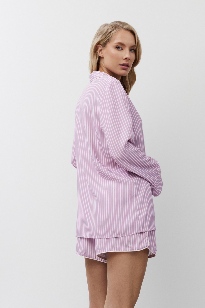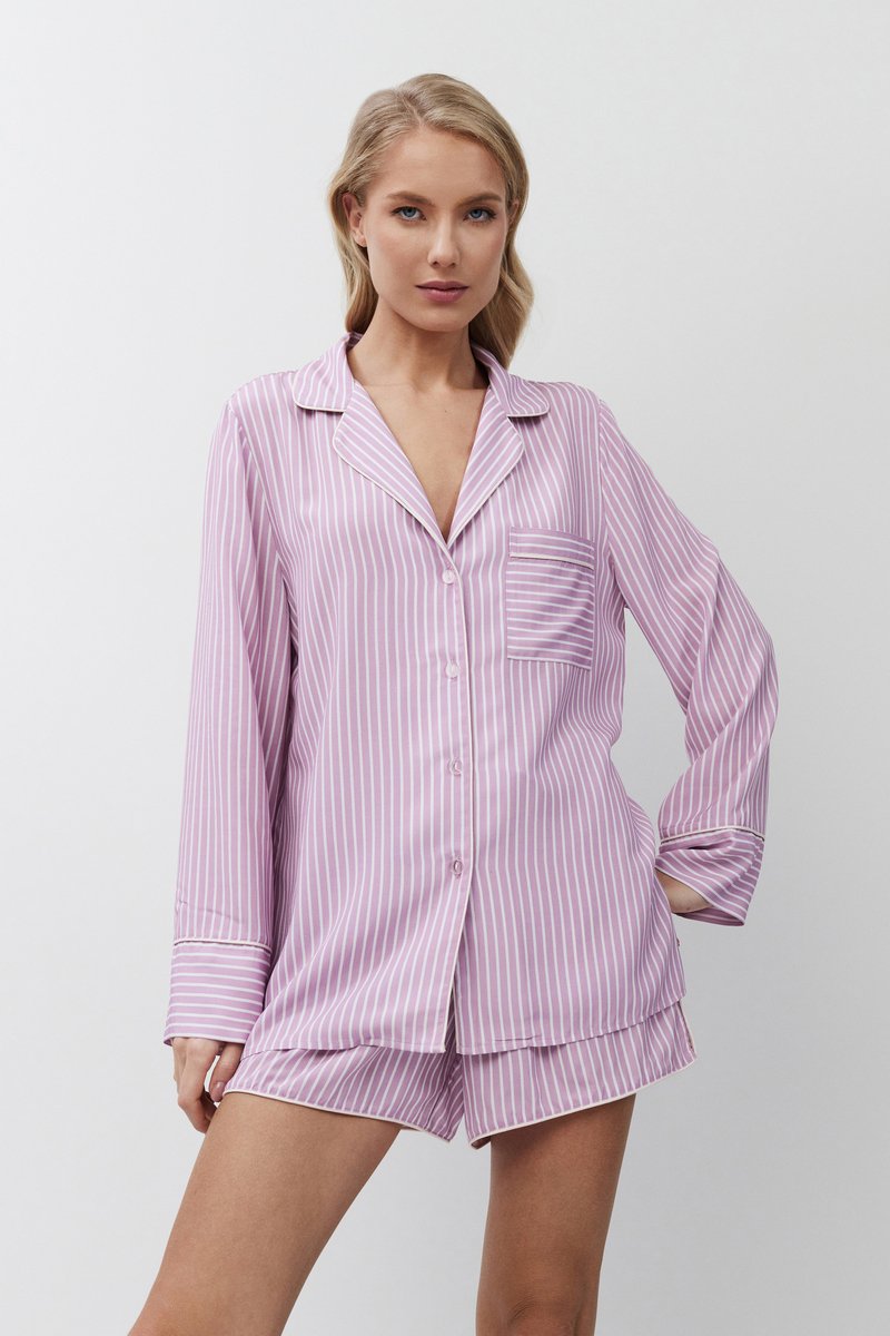 Пижама женская с шортами MARGARETH для вашего ночного комфорта. Пижама выполнена из вискозы. Рубашка на пуговицах, с длинными рукавами, отложным воротником и нагрудным карманом. Окантовка дополняет и украшает комплект. Шорты короткие, свободной формы, с эластичным поясом с завязкой. Расслабьтесь с максимальным комфортом и стилем в пижаме MARGARETH.