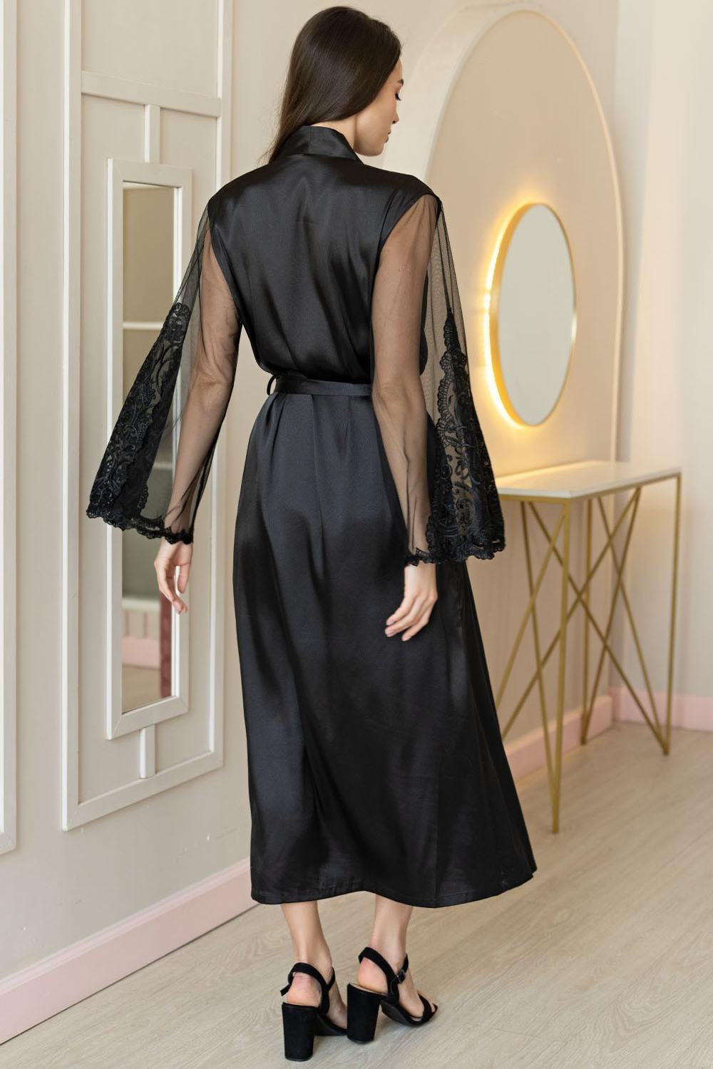 Длинный запашной халат Mia-Amore с длинными широкими рукавами выполнен из принтованного смесового шёлка. Широкие рукава халата выполнены из мягкой сетки и декорированы кружевными вставками. Халат комплектуется широким поясом, в боковых швах карманы.