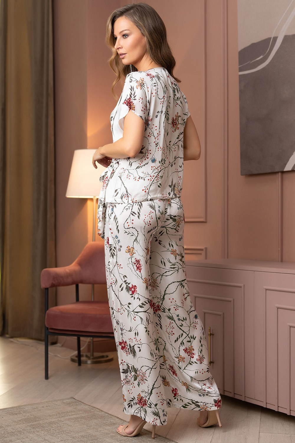 Комплект Mia-Amore состоит из топа с коротким рукавом и широких брюк. Брюки с широким эластичным поясом. Комплект выполнен из принтованного смесового шелка с однотонной отделкой. Ширину топа можно регулировать за счет пояса расположенного на уровне талии. В боковых швах брюк обработаны карманы.