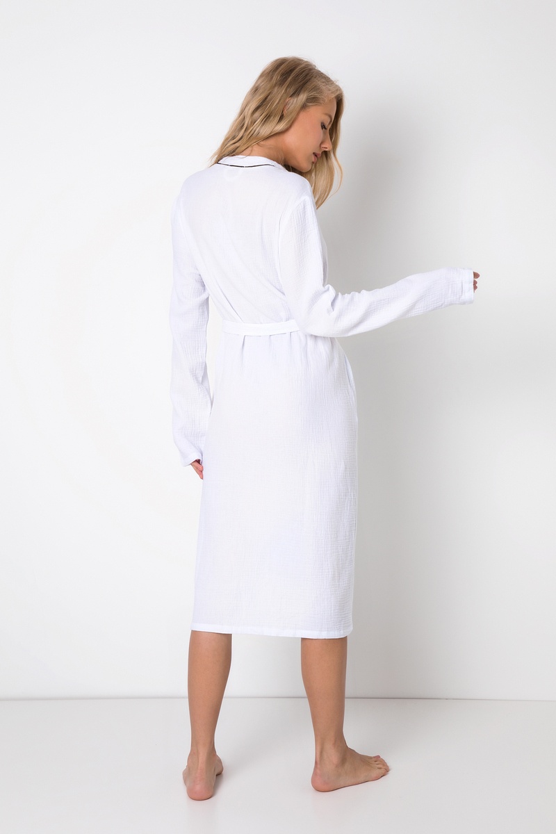 Муслин - бесспорный фаворит в жаркий период времени! Наденьте этот халат из чистого двойного хлопка в жаркий летний день! Халат классической формы украшен черным кантом вокруг воротника и боковых карманов. Халат можно завязать поясом, а также он дополнительно завязывается внутренними шнурами для удобства движений.