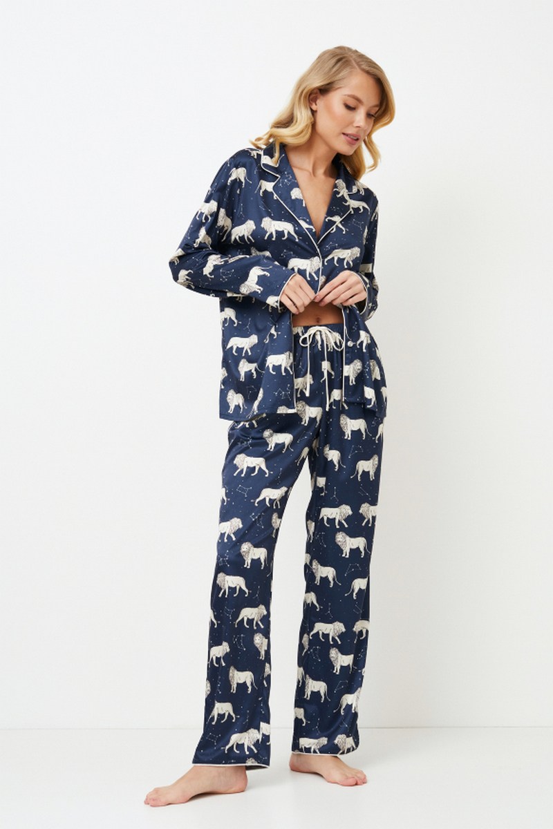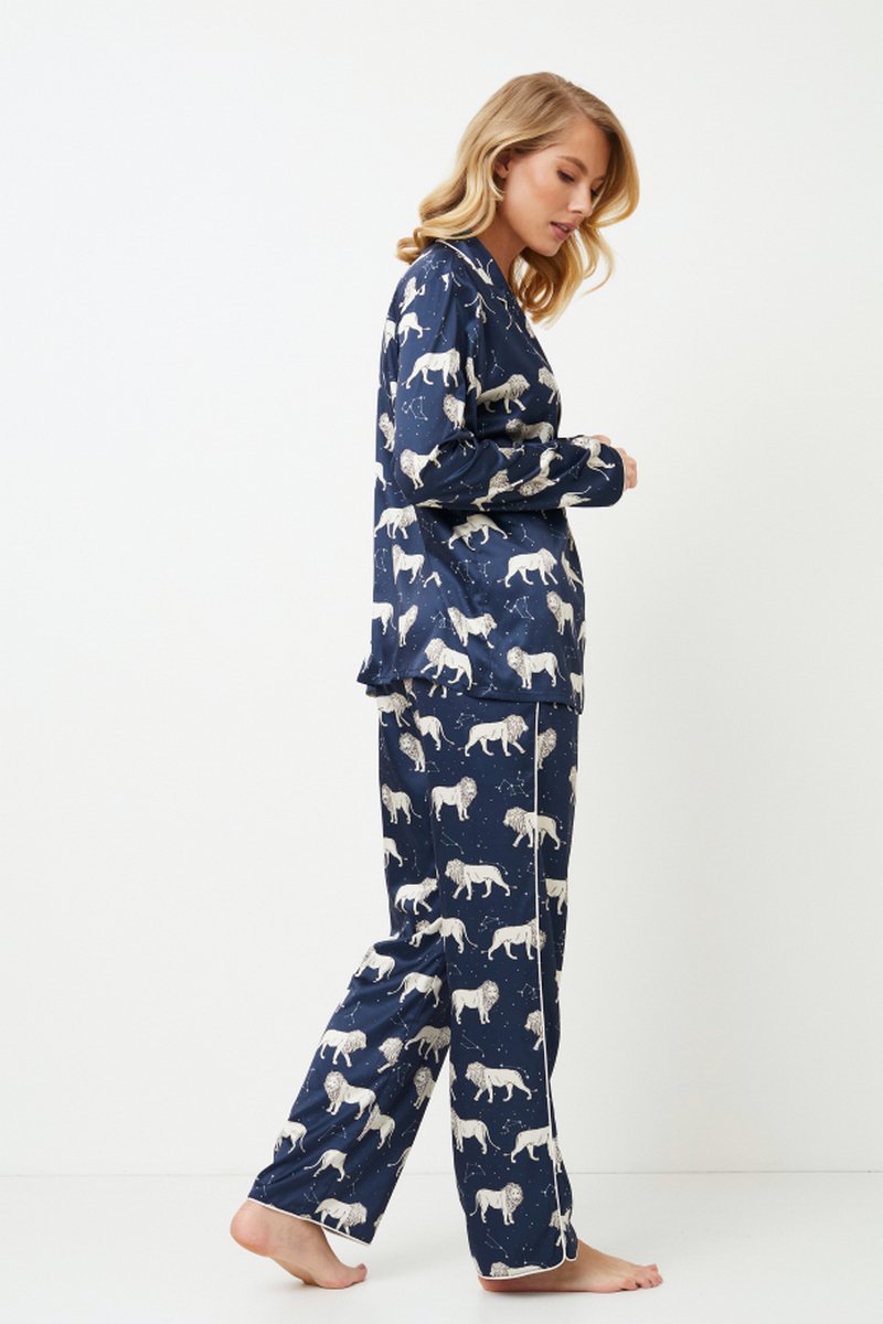 Представляем вашему вниманию длинную пижаму Nala, в которой мечты уносятся в голубое ночное небо. Комплект выполнен из легкой атласной ткани, которая придаст вашей одежде для сна дополнительную роскошь. Рубашка с длинными рукавами и изящным V-образным воротником, украшенным кантом и застегивающимся спереди на пуговицы, подготовит вас к прекрасному ночному сну. Вместе с длинными брюками классического кроя с окантовкой по бокам и низу, завязками на талии и карманами пижамный комплект украшен львами и звездными созвездиями. Этот комплект приглашает вас совершить космическое путешествие и погрузиться в сказочную страну...