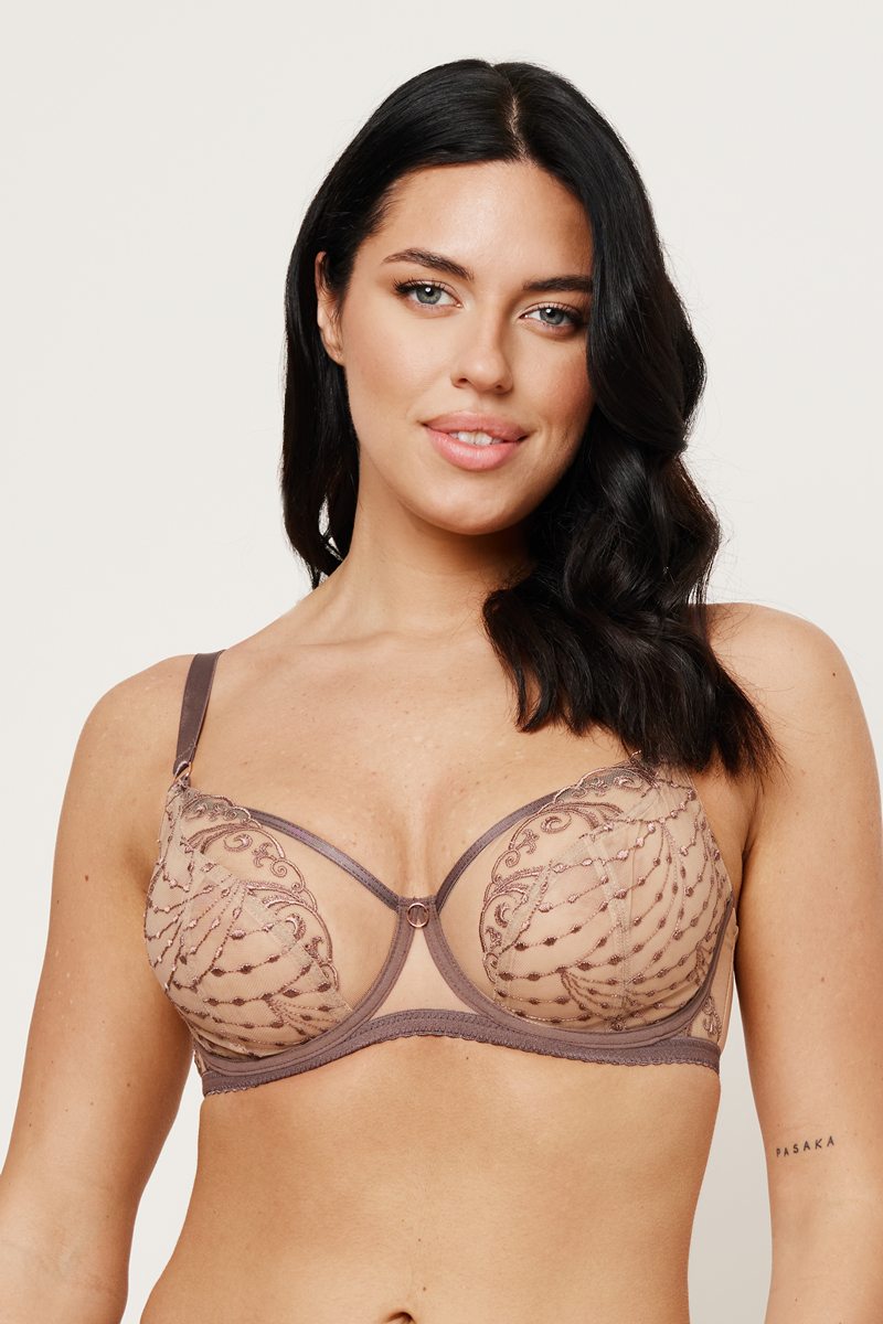 Бюстгальтер NAOMI MOCCA от европейского производителя Subtille. Выполнен из нежного микротюля с вышивкой. Мягкая чашка на кости в конструкции S-02 (глубокий, грудь более закрыта сверху, увеличена ширина пояса), форма OPS. Несъемные регулируемые бретели. Золотые аксессуары.