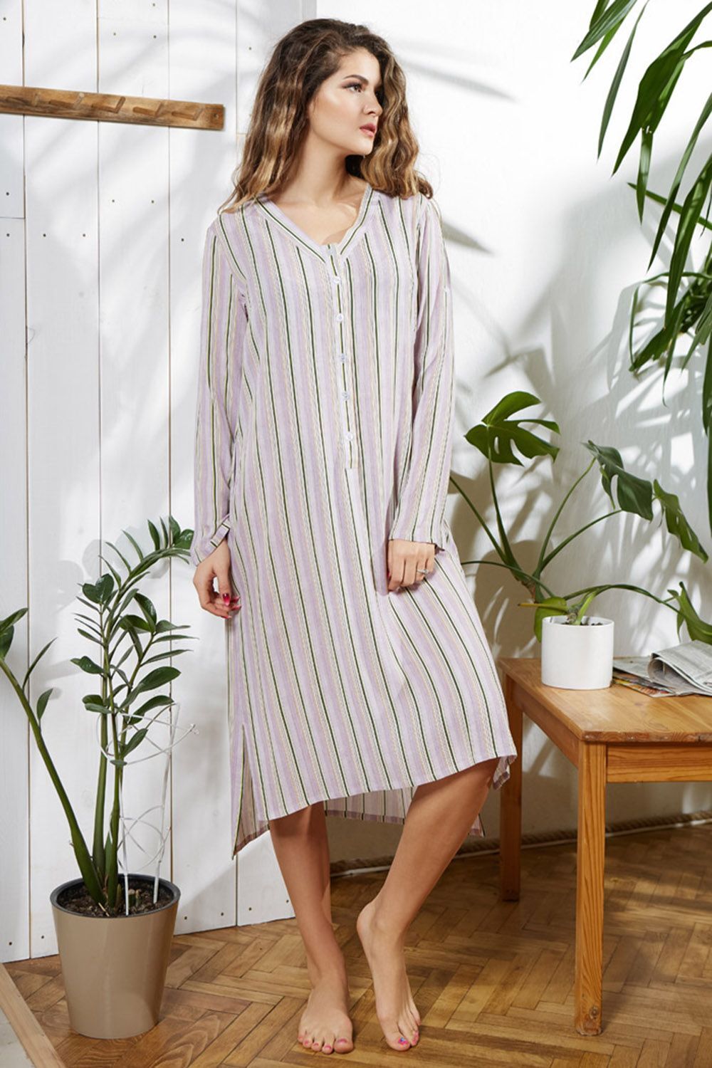 Туника домашняя женская Миа-Миа выполнена из принтованной вискозы. Модель свободного силуэта длиной миди. Рукав изделия прямой до запястья с хлястиком для регулировки длины. Фигурный вырез горловины с планкой-застежкой на пуговицах до талии. В боковых швах изделия разрезы.