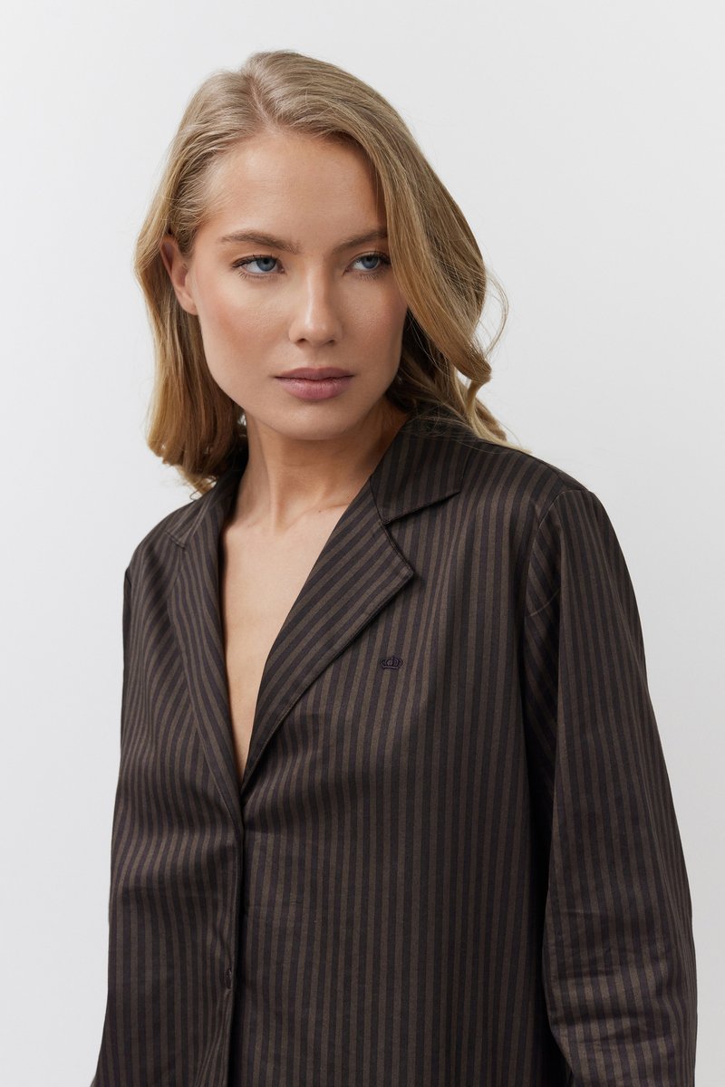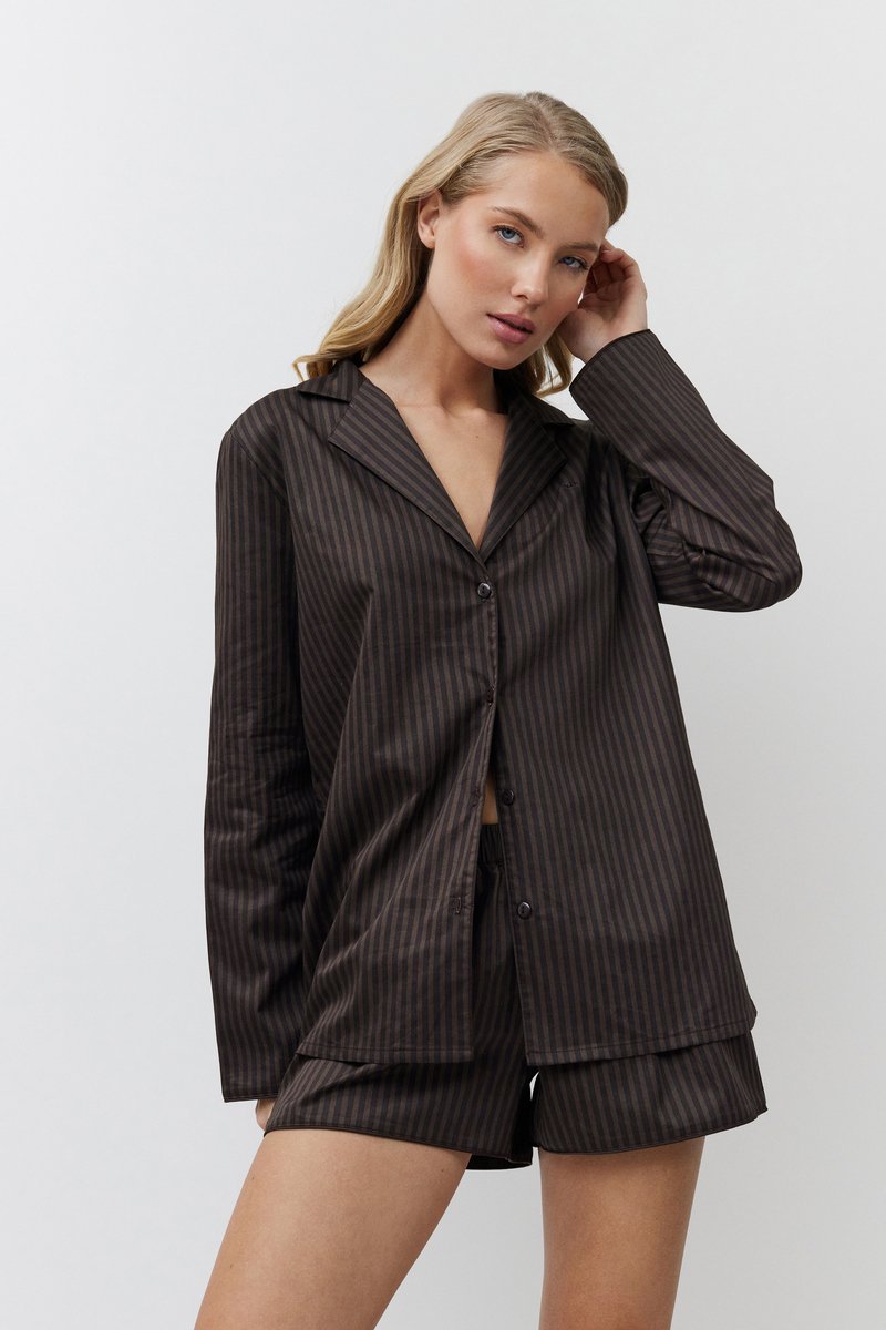 Пижама женская с шортами NOEMIE для вашего ночного комфорта. Пижама выполнена из текстильного хлопка в полоску с легким блеском. Рубашка на пуговицах, с длинными рукавами и отложным воротником. Окантовка по низу рукавов и штанов. Шорты свободные, эластичный пояс украшен двумя пуговицами. Расслабьтесь с максимальным комфортом и стилем в пижаме NOEMIE.