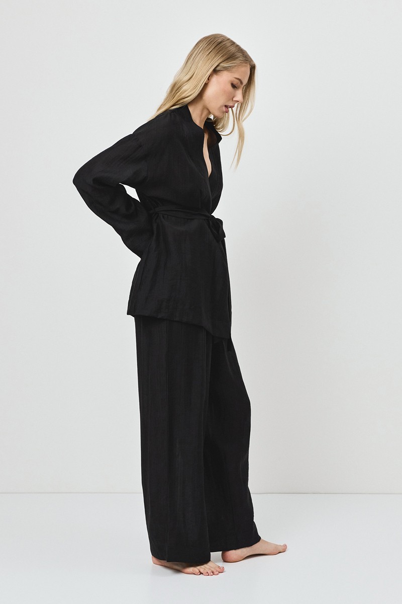 Представляем вам комплект NOIR — воплощение лёгкого стиля и комфорта, идеально подходящее для неспешных прогулок или морских приключений. Комплект женский со штанами из легкого материала тенсель. Рубашка с длинными рукавами. Поясок подчеркивает талию. Штаны длинные, свободного кроя.