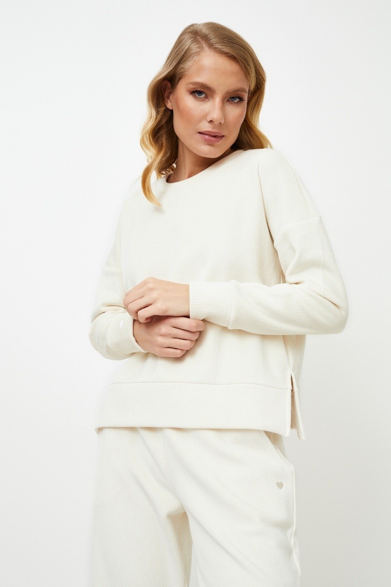 Комплект Novella soft - идеальный вариант для отдыха! Топ с длинными рукавами, округлым вырезом горловины, стильными боковыми разрезами и манжетами на рукавах, украшенными вышивкой в виде милого сердечка. Брюки обычного кроя с карманами и эластичным поясом. Комплект изготовлен из ткани в полоску цвета слоновой кости. Подарите себе незабываемые впечатления от отдыха с Norella set soft! Материал велсофт в рубчик.