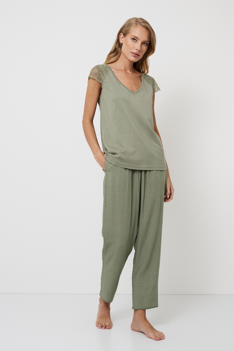 Представляем вашему вниманию нашу очаровательную пижаму Odelia, в которой каждая деталь — восхитительный сюрприз, ожидающий своего открытия. Топ, сшитый из роскошной хлопково-модалной смеси в успокаивающем оливковом цвете. V-образный вырез и кружевные короткие рукава придают ему женственное очарование. Брюки длиной до щиколотки, сшитые из мягкой вискозы, дополнены регулируемым поясом-бантом и зелёной окантовкой. Они украшены очаровательным приглушённым абстрактным узором, который дополняет кружевные детали топа. Погрузитесь в очарование пижамы Odelia и испытайте новые ощущения от домашней одежды. Состав: футболка 50% хлопок, 50% модал; шорты 100% вискоза.