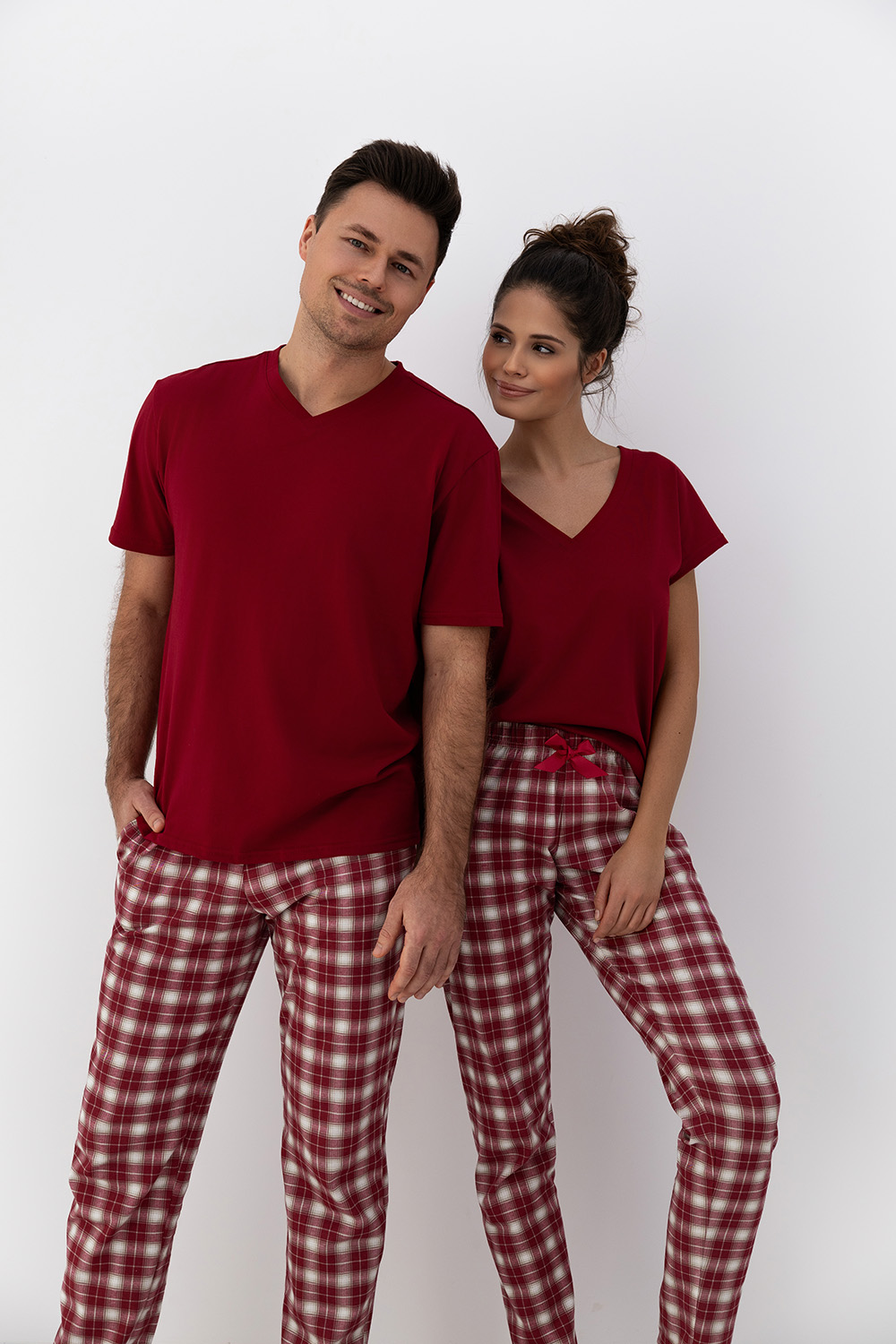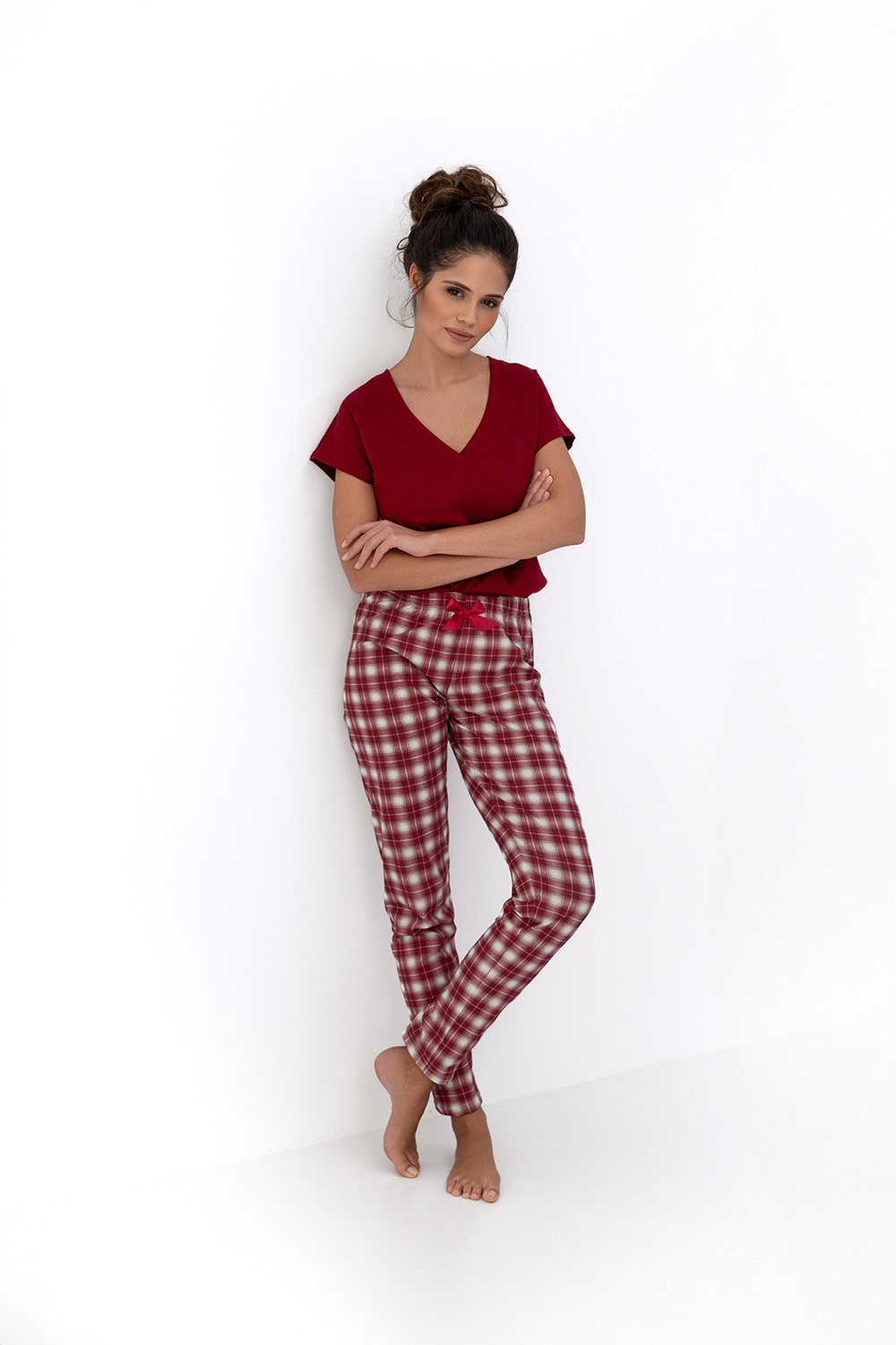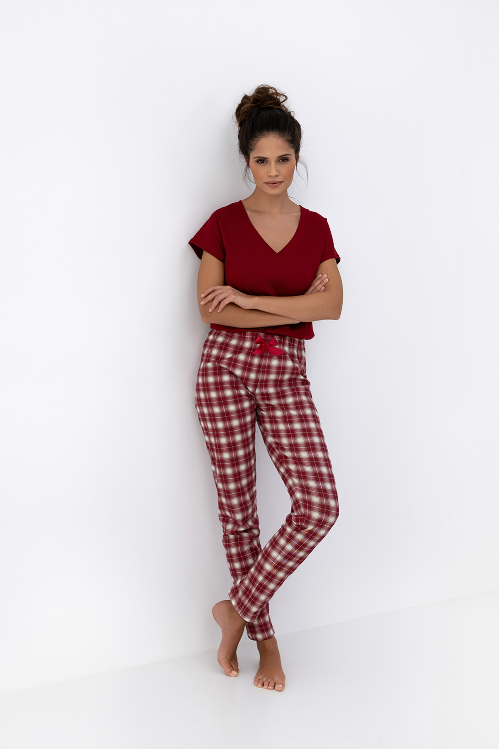 Пижама Alivia темно-красного цвета состоит из зауженных брюк в клетку и футболки с v-образным вырезом. Брюки на широкой резинке, декорированы бантиком на поясе. Идеальный вариант не только для сна, но и для домашнего отдыха.
