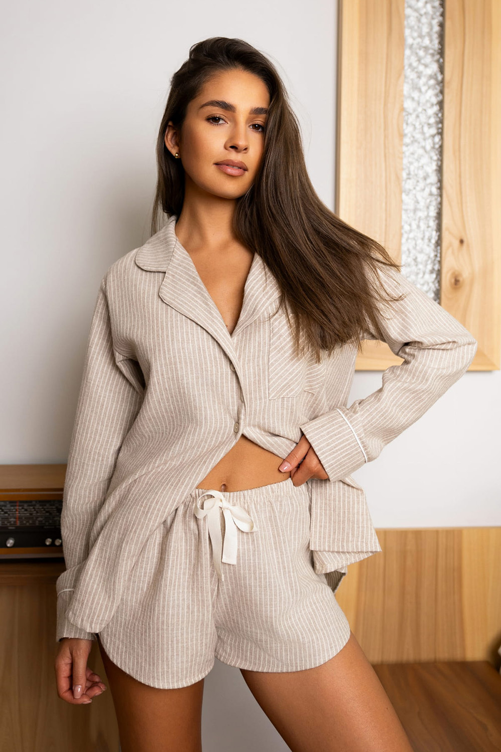 Пижама Allison бежевого цвета состоит из рубашки и брюк. Рубашка на пуговицах. Шорты на широкой резинке. Декорированы бантиком на поясе. Идеальный вариант не только для сна, но и для домашнего отдыха.