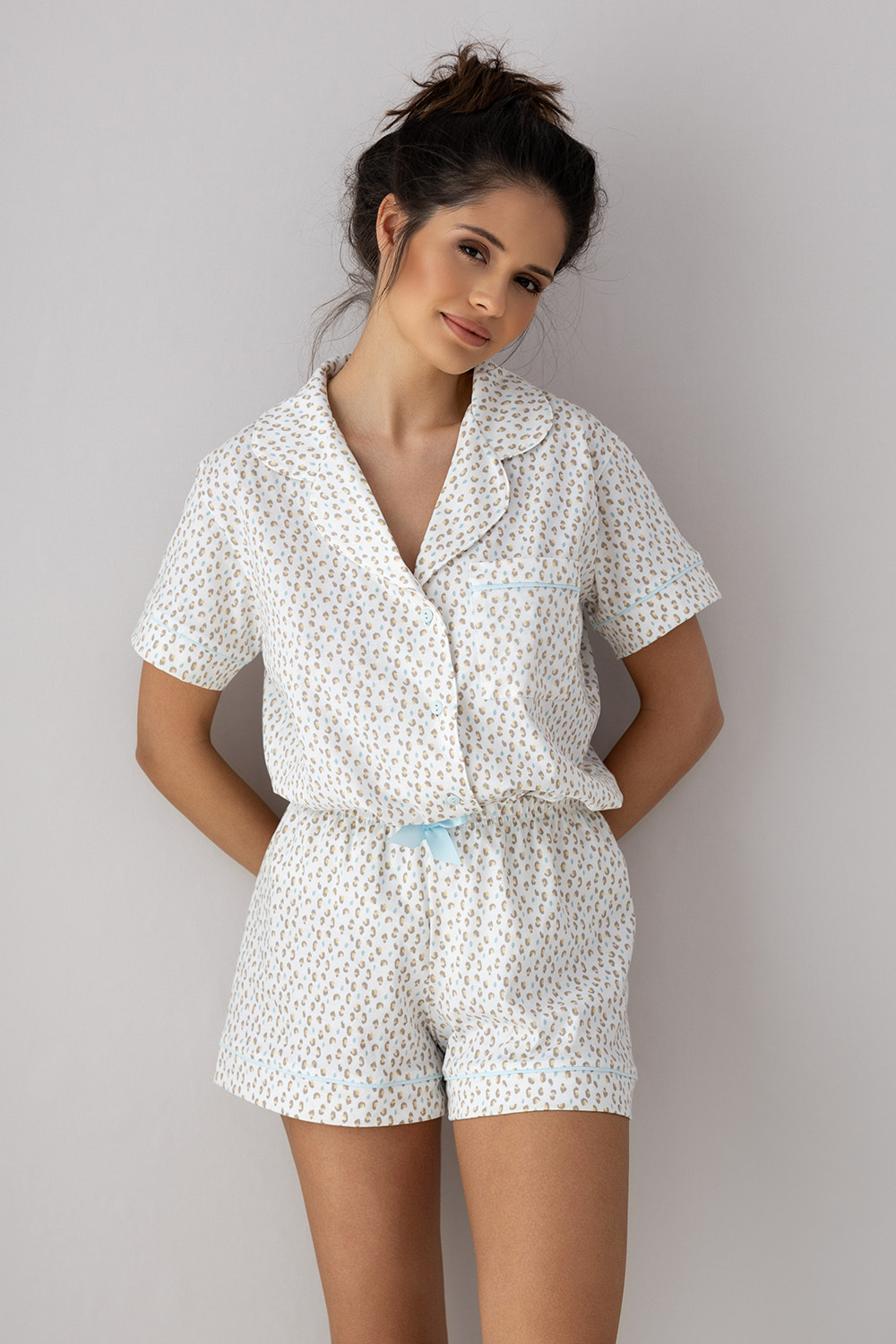 Пижама Amalia состоит из рубашки и шортиков с минималистичным животным принтом. Рубашка прямого кроя на пуговицах, с контрастным кантом. Шортики прямые, резинка декорирована ярким бантиком. Идеальный вариант не только для сна, но и для домашнего отдыха.