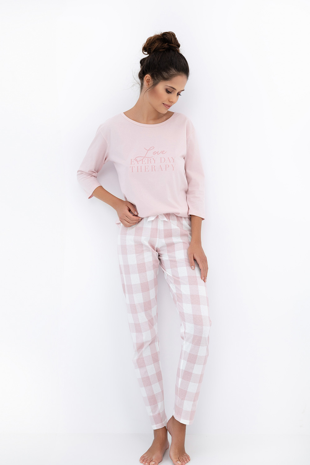 Хлопковая пижама Annabelle состоит из прямых брюк в клетку и однотонного лонгслива с надписью на груди. Брюки на широкой резинке. Рукава 3/4. Идеальный вариант не только для сна, но и для домашнего отдыха.