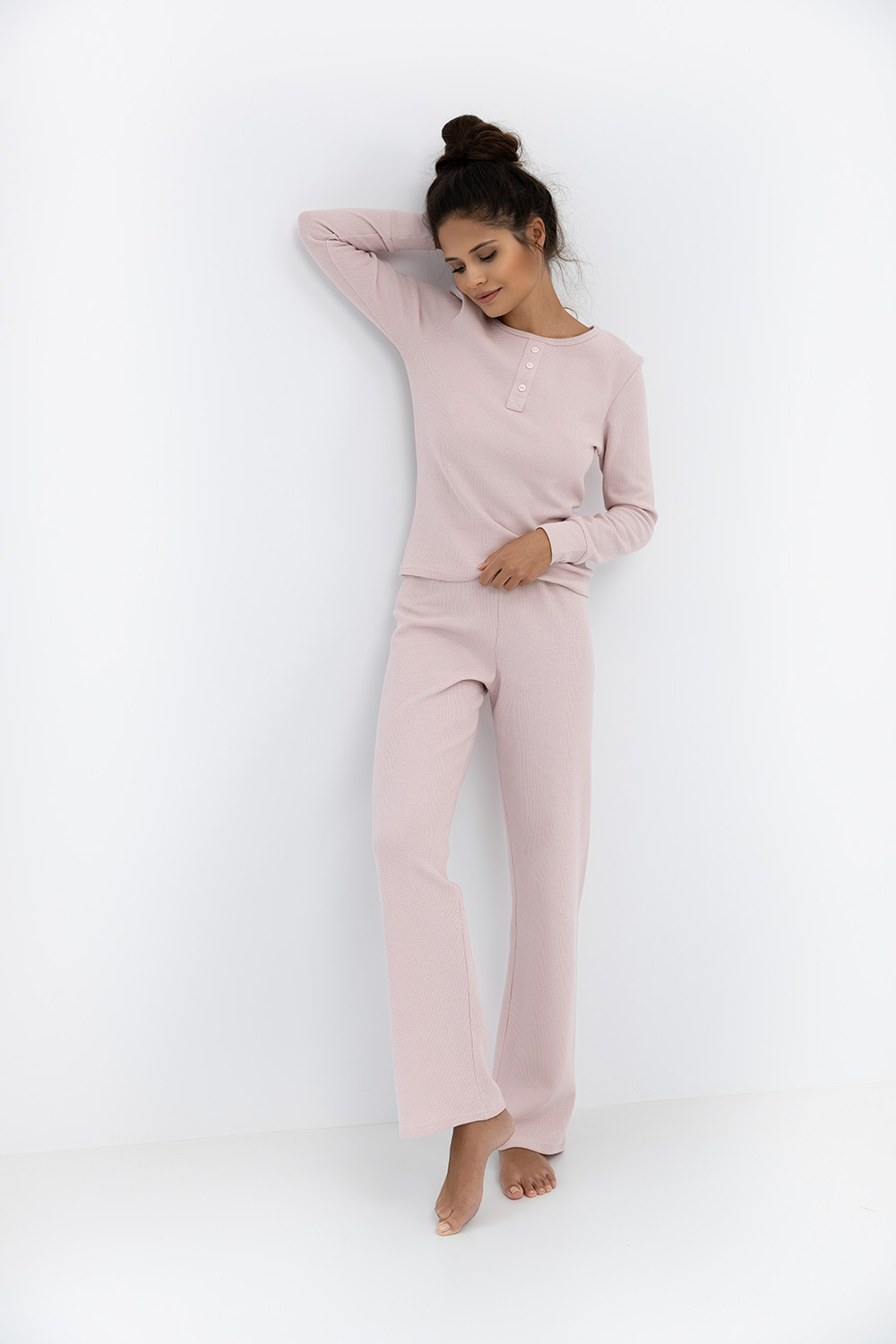 Домашний комплект Arlette состоит из лонгслива с длинным рукавом и прямых брюк. Материал изделия в рубчик, мягкий и невероятно приятный к телу. Круглый вырез горловины, воротник на кулиске. Идеальный вариант не только для сна, но и для домашнего отдыха.