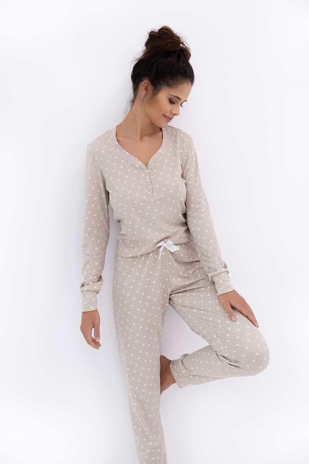 Милый домашний комплект Calliope с мелким цветочным принтом состоит из зауженных брюк и лонгслива с длинным рукавом. Рукава лонгслива и брюки оформлены манжетами. Глубокий v-образный вырез горловины, воротник на кулиске. Идеальный вариант не только для сна, но и для домашнего отдыха.