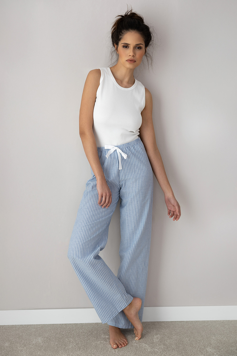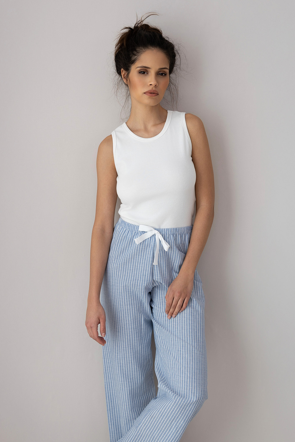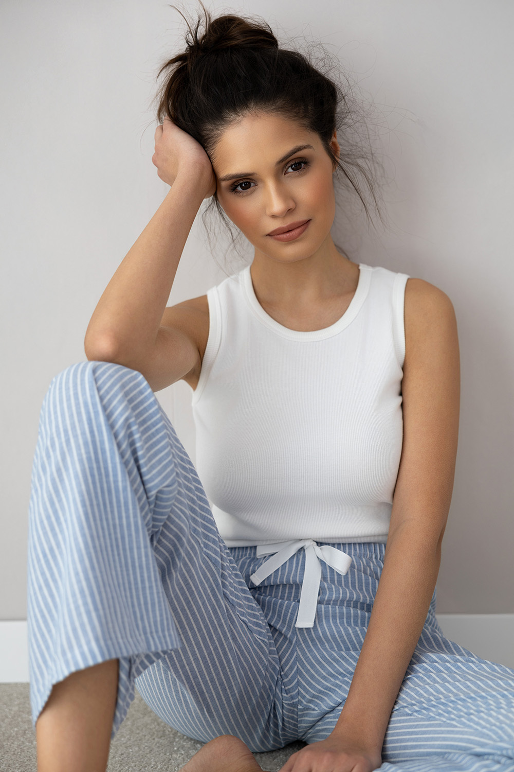 Повседневная пижама Dagna состоит из топа и брюк. Топ облегающий, на широких бретелях, в рубчик. Брюки прямые, с контрастным бантиком, в полоску. Идеальный вариант не только для сна, но и для домашнего отдыха. Состав брюк: 100% вискоза
