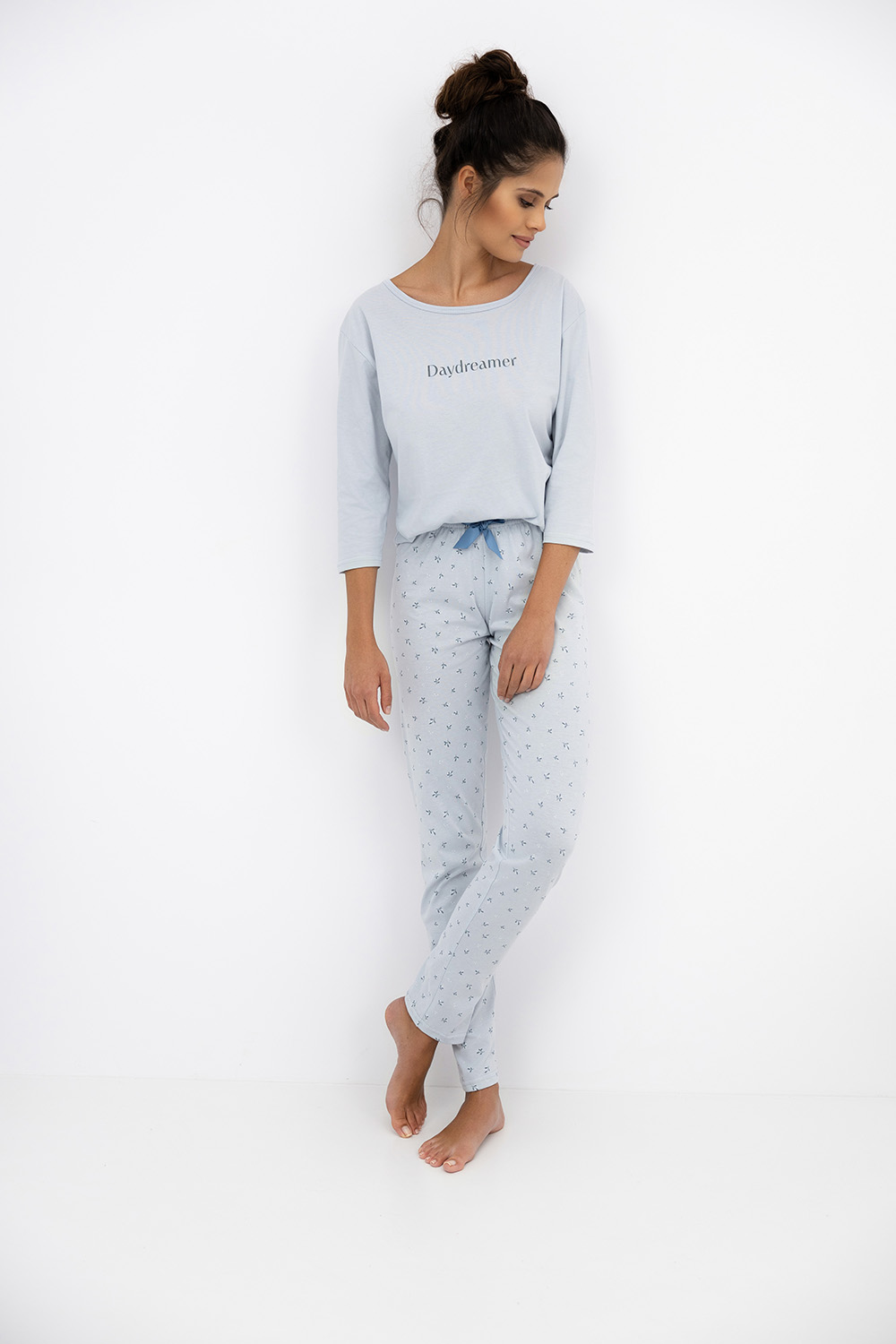 Повседневная пижама Daydreamer состоит из лонгслива и зауженных брюк. На груди надпись, брюки оформлены мелким растительным принтом. Вырез горловины круглый, широкий. Идеальный вариант не только для сна, но и для домашнего отдыха.
