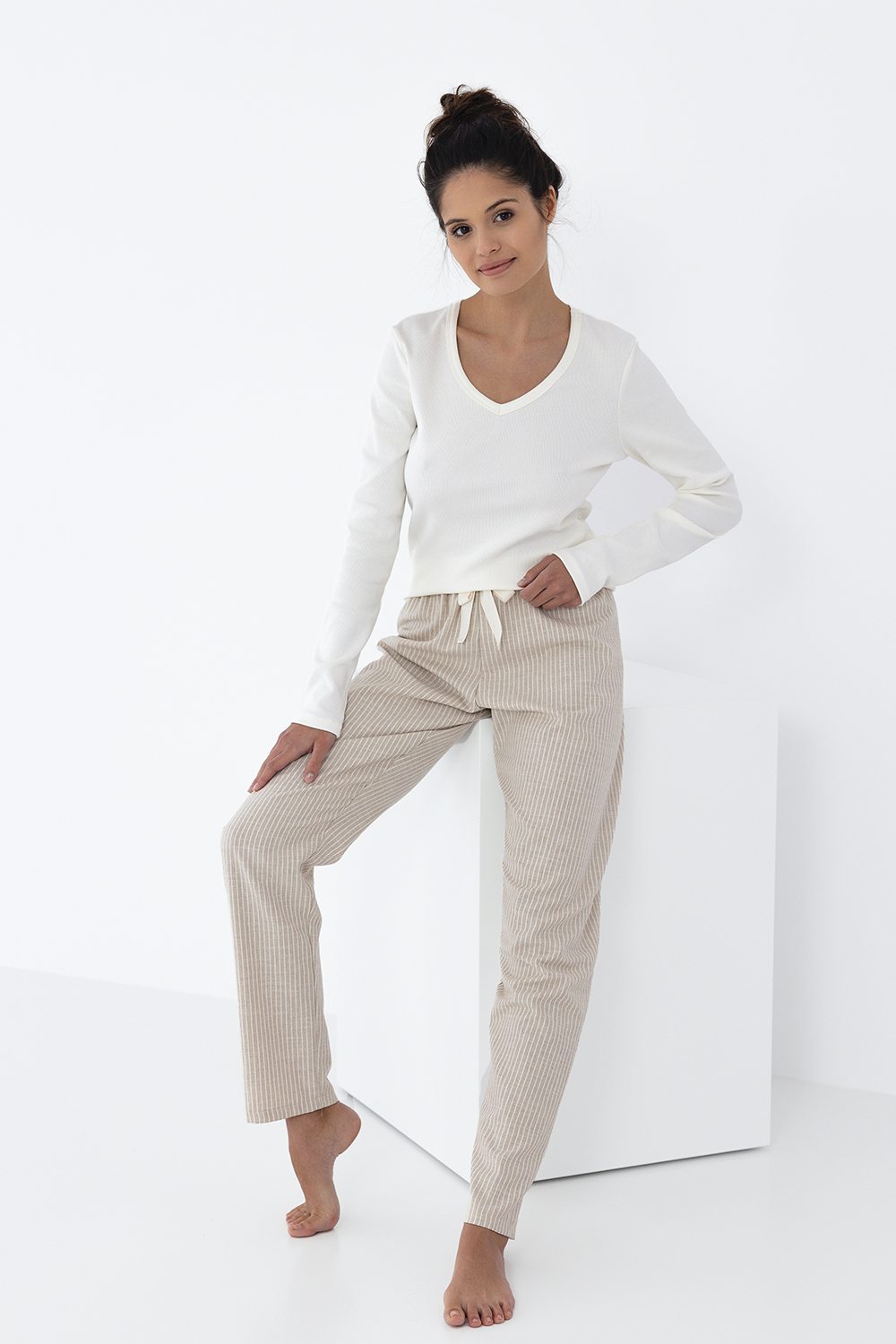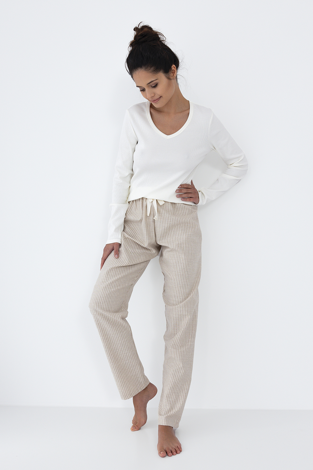 Пижама Dinah состоит из лонгслива прямого кроя и брюк. Однотонный лонгслив с v-образным вырезом горловины. Брюки прямые, на широкой резинке. Состав брюк: хлопок 80%, полиэстер 20%. Идеальный вариант не только для сна, но и для домашнего отдыха.