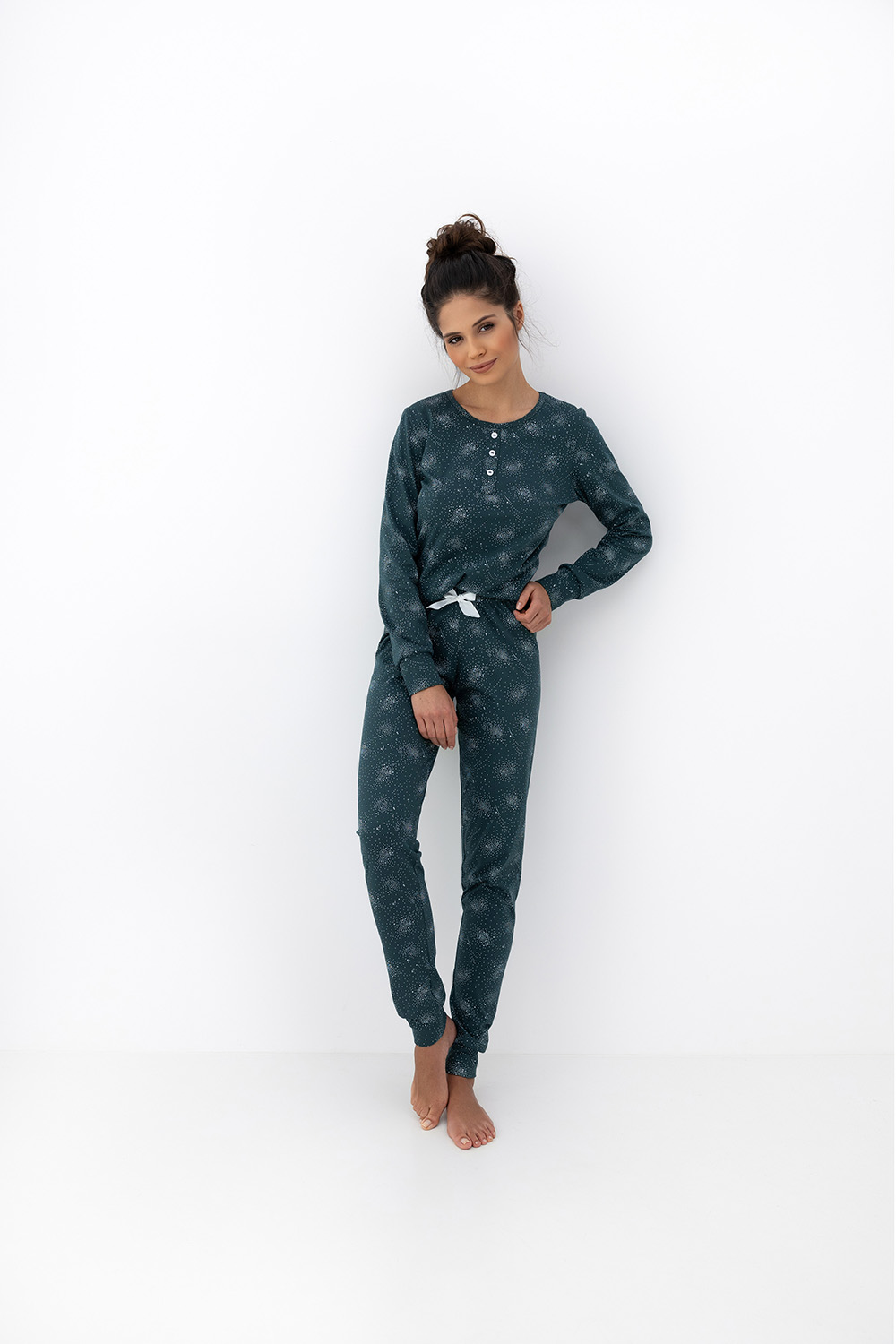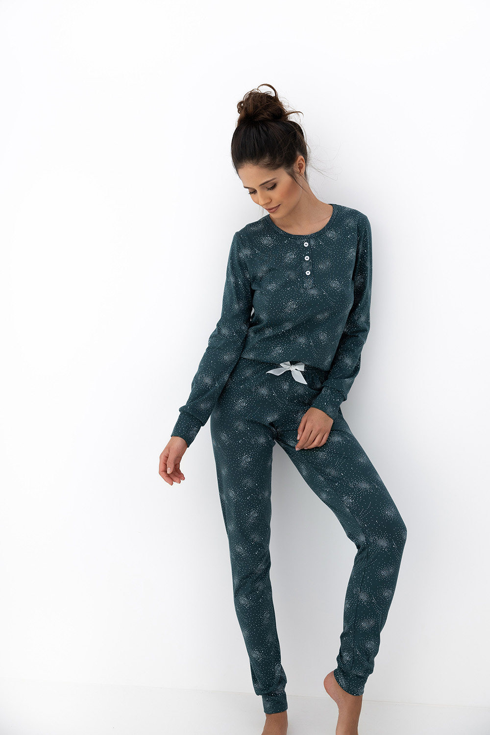 Домашний комплект Ellison состоит из зауженных брюк в и лонгслива с длинными рукавами. Брюки на широкой резинке, декорированы бантиком на поясе. Рукава лонгслива и брюки оформлены манжетами. Круглый вырез горловины, воротник на кулиске. Идеальный вариант не только для сна, но и для домашнего отдыха.