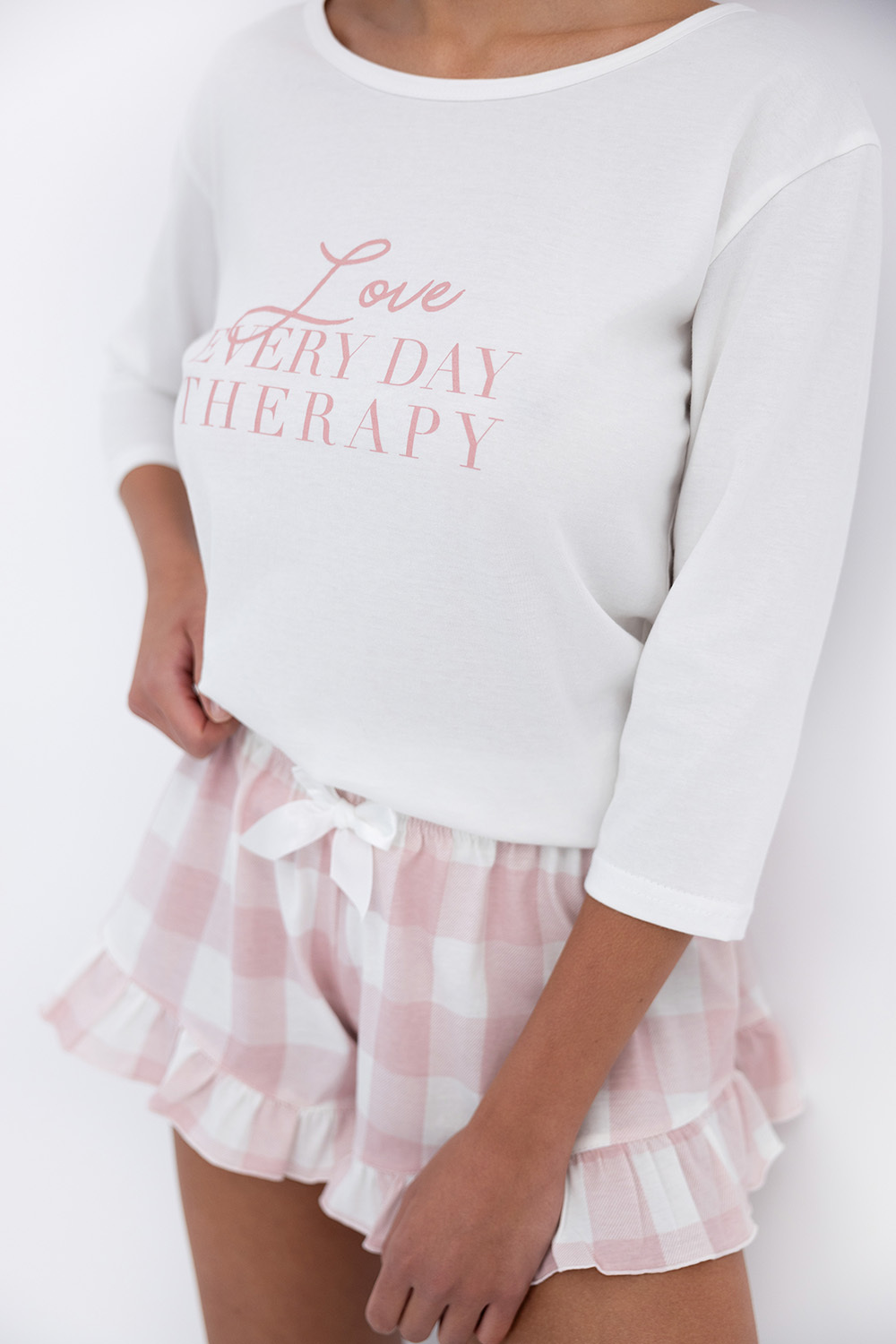 Милая пижама Emily состоит из шортиков в клетку и однотонного лонгслива с надписью на груди. Шортики декорированы рюшами. Рукава лонгслива длиной 3/4. Резинка шорт широкая, декорирована миниатюрным бантиком. Идеальный вариант не только для сна, но и для домашнего отдыха.