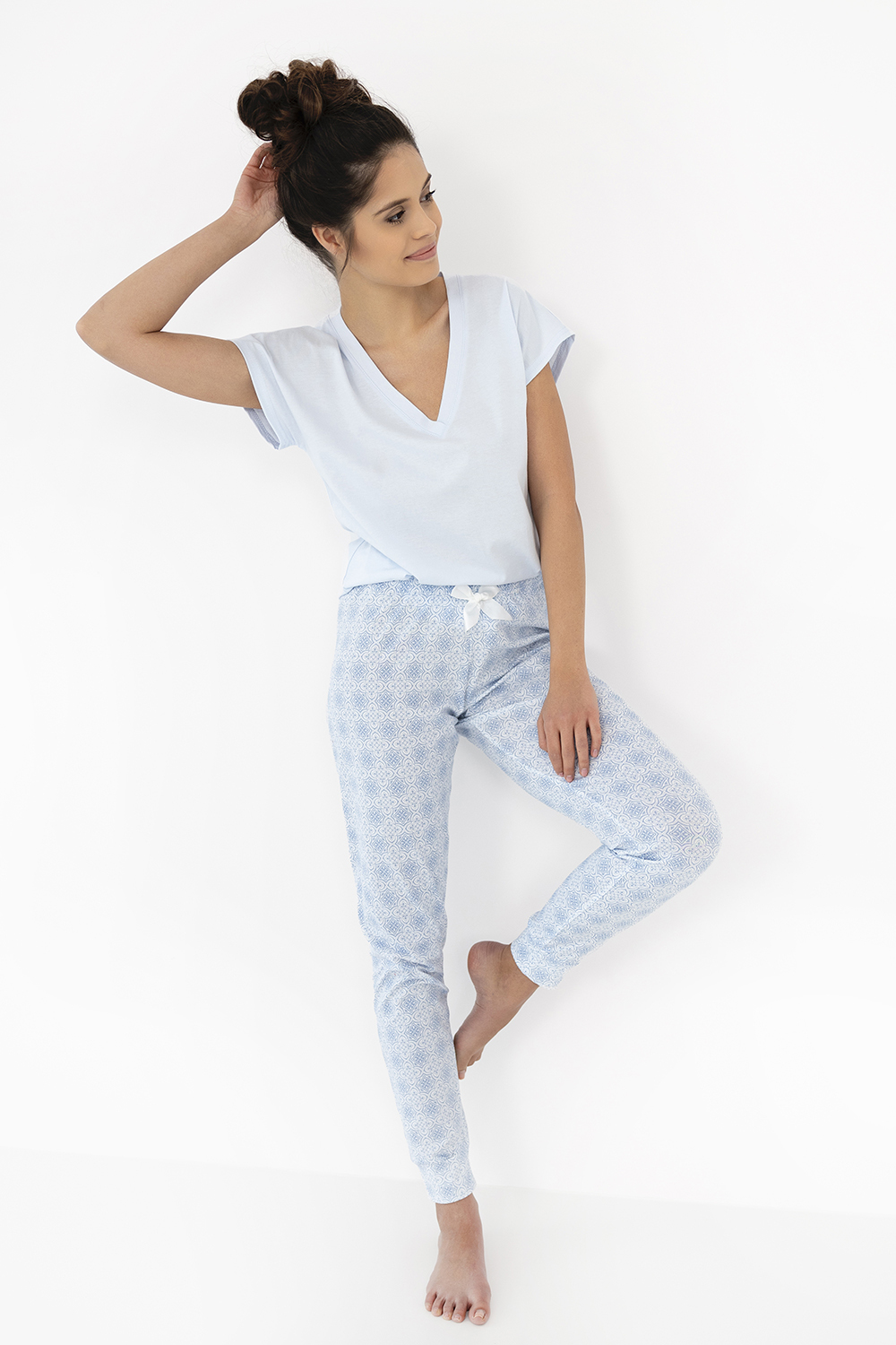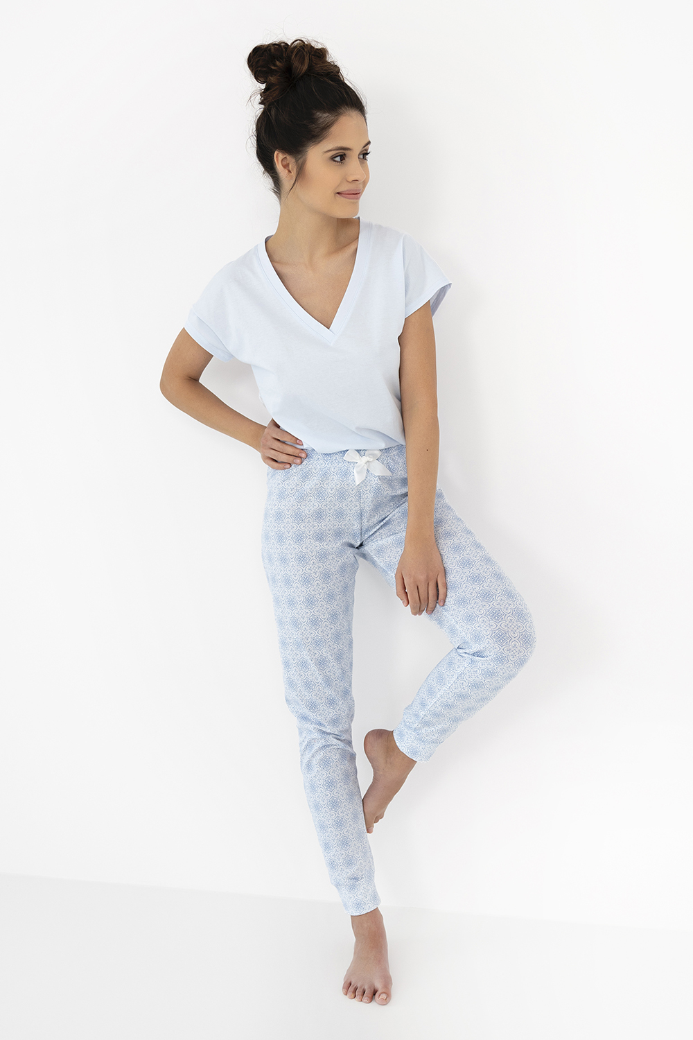 Хлопковая пижама Evelina состоит из футболки и брюк в крупную клетку. Футболка приталенная, с v-образным вырезом горловины. Брюки прямые, на широкой резинке. Декорированы миниатюрным атласным бантиком. Идеальный вариант не только для сна, но и для домашнего отдыха.