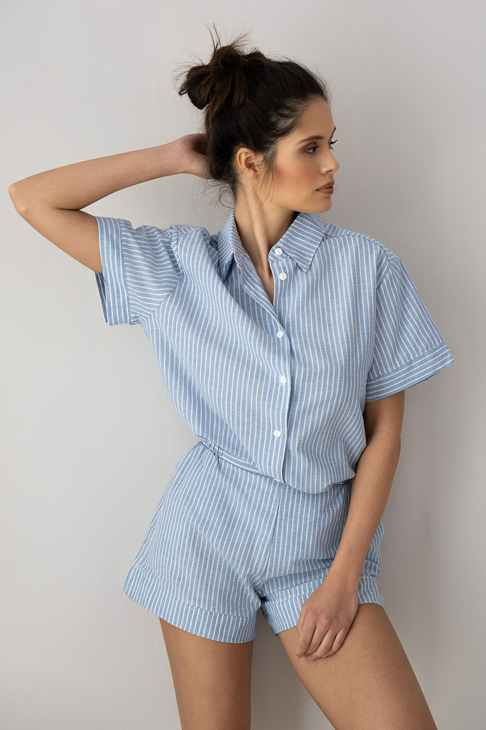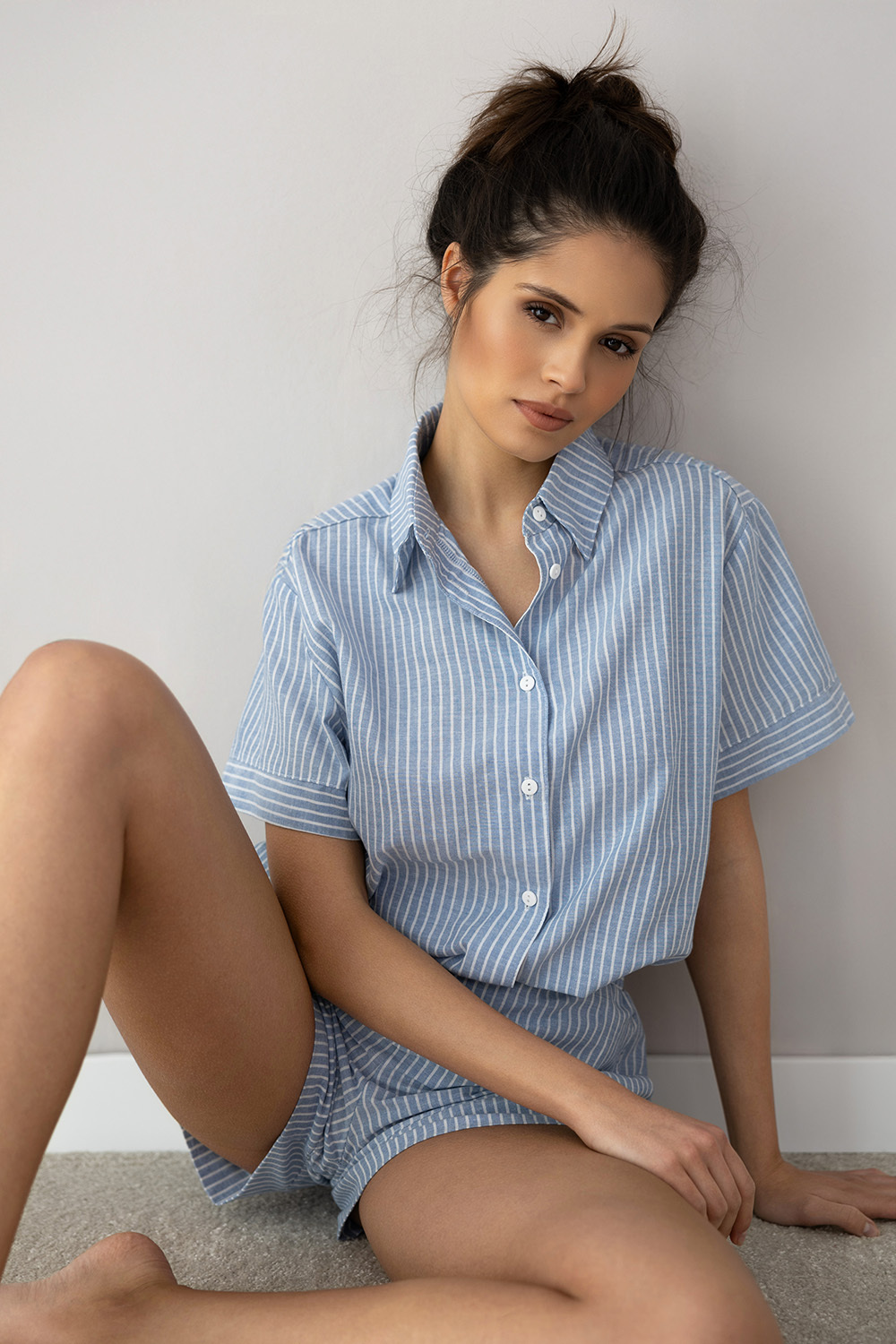 Классический комплект Jany состоит из рубашки и шорт. Рубашка прямая, на пуговицах. Материал декорирован принтом полоска. Идеальный вариант не только для сна, но и для домашнего отдыха.