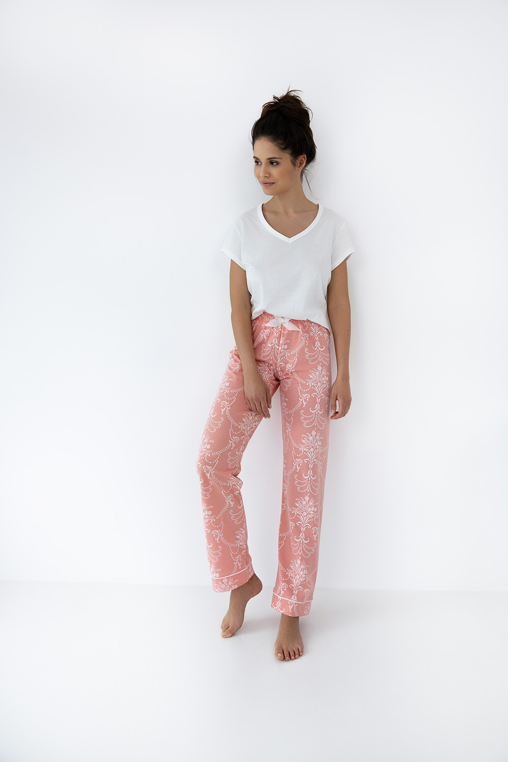 Изысканная пижама Kalina состоит из футболки и брюк. Футболка однотонная с v-образным вырезом. Брюки прямые с интересным принтом. Идеальный вариант не только для сна, но и для домашнего отдыха.