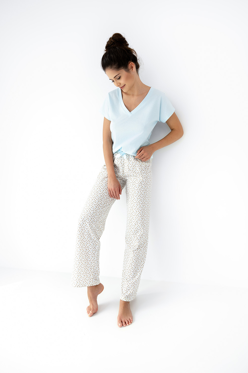 Изысканная пижама Kira состоит из футболки и брюк. Футболка однотонная с глубоким v-образным вырезом. Брюки прямые с минималистичным принтом. Идеальный вариант не только для сна, но и для домашнего отдыха.