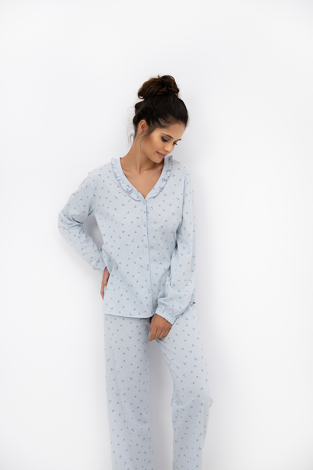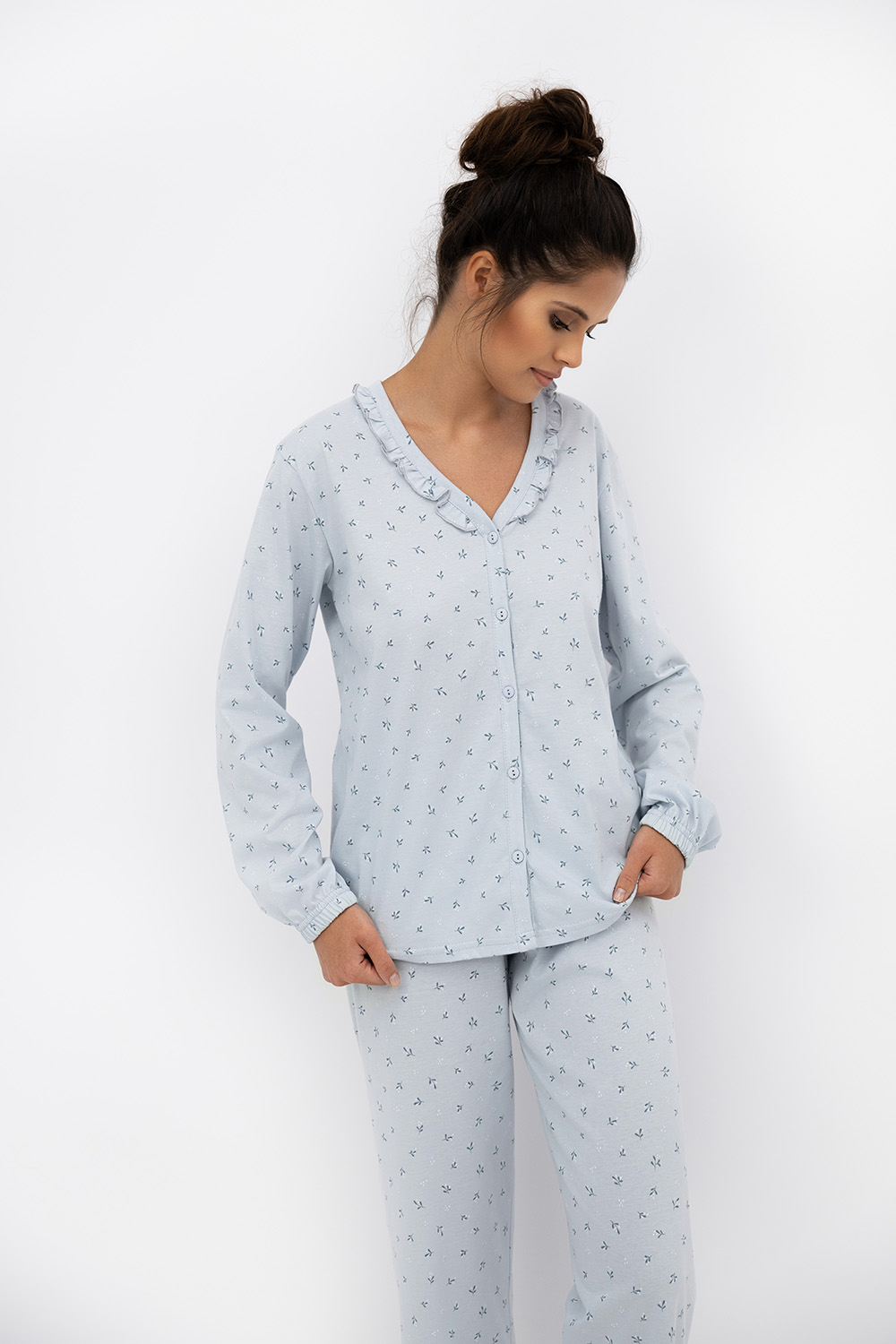 Очаровательный комплект для сна Lucille состоит из прямых брюк и рубашки на пуговицах. Брюки на широкой резинке. Материал изделия выполнен с минималистичным растительным принтом. Идеальный вариант не только для сна, но и для домашнего отдыха. Состав брюк: хлопок 50%, вискоза 50%.