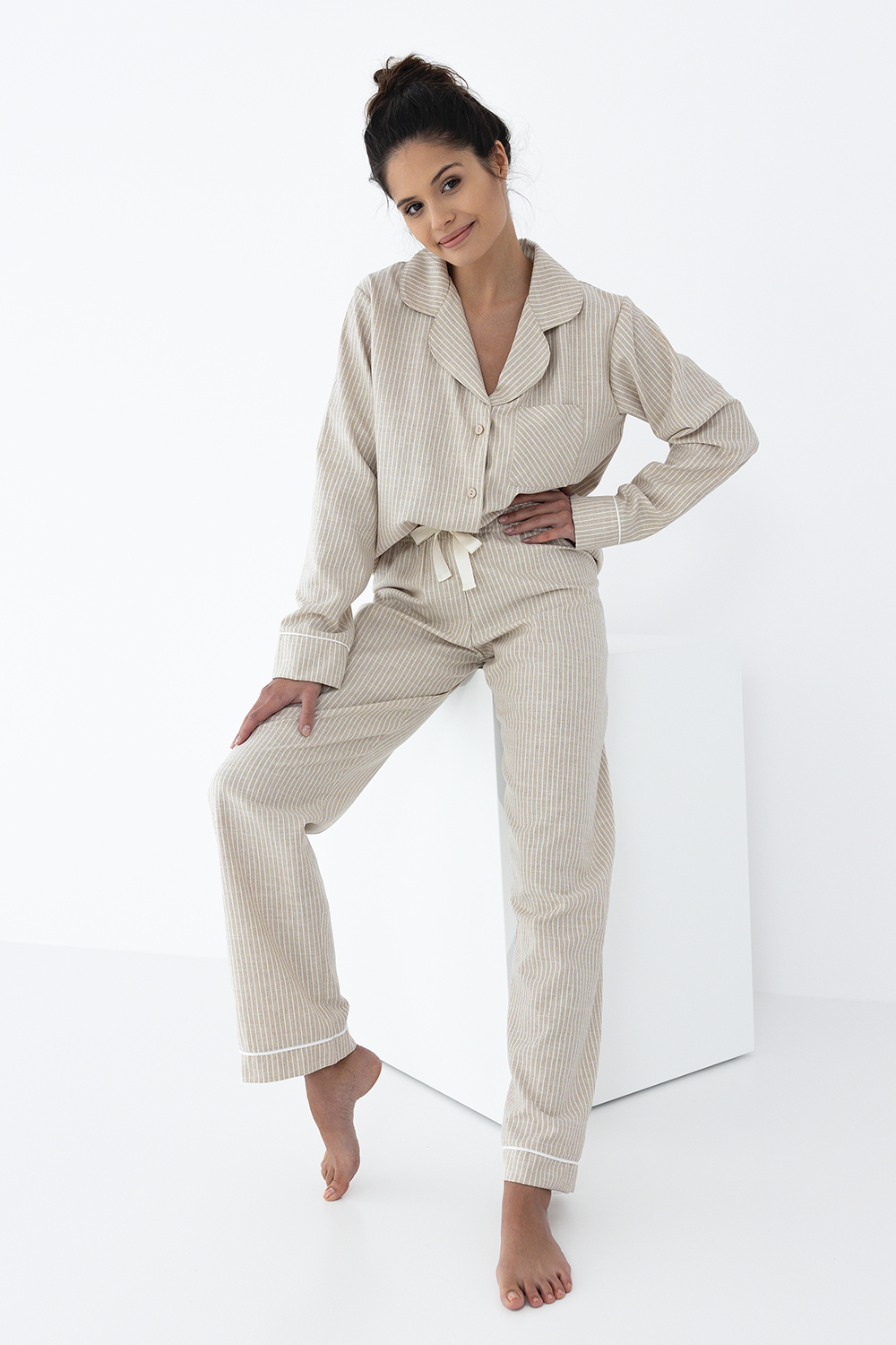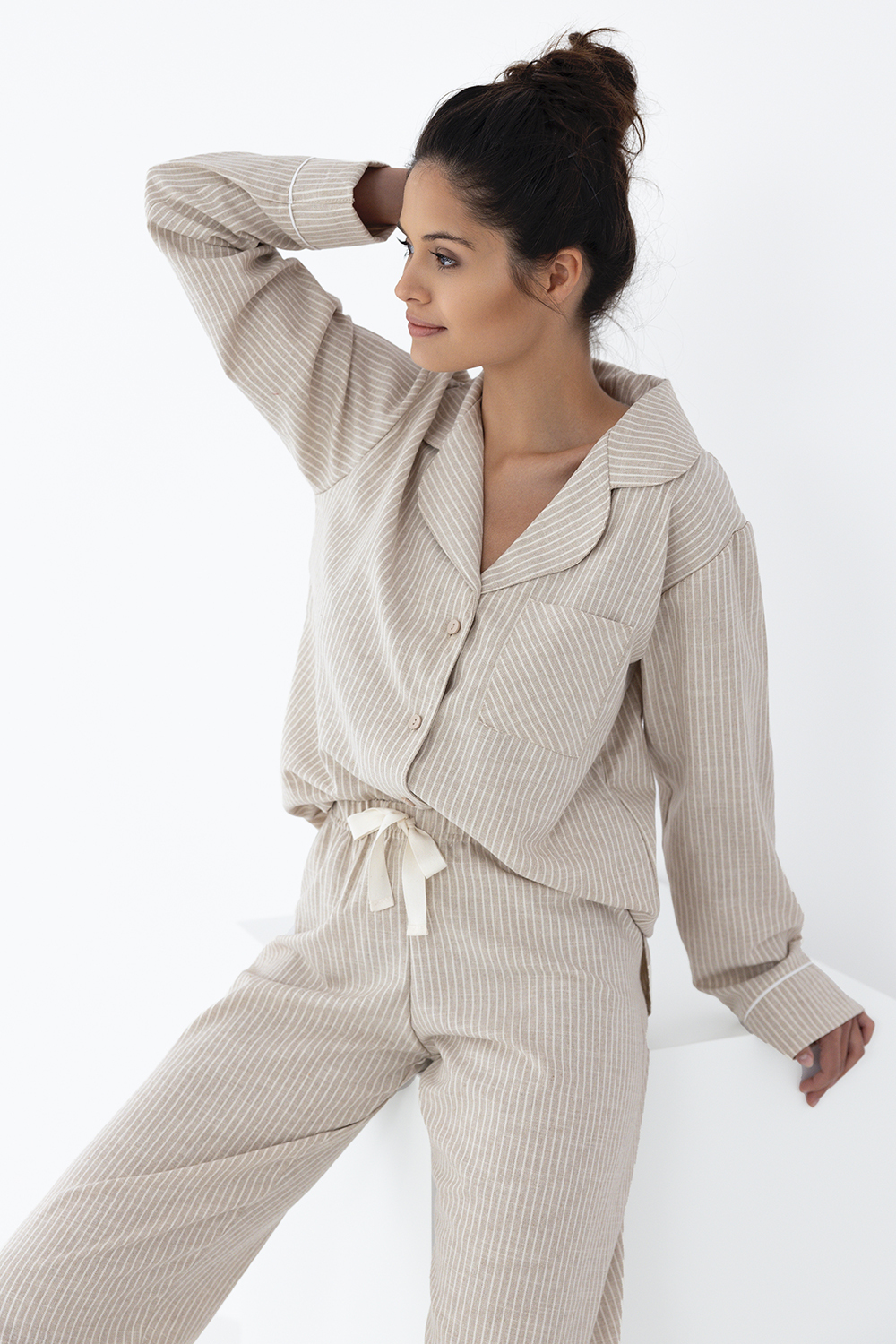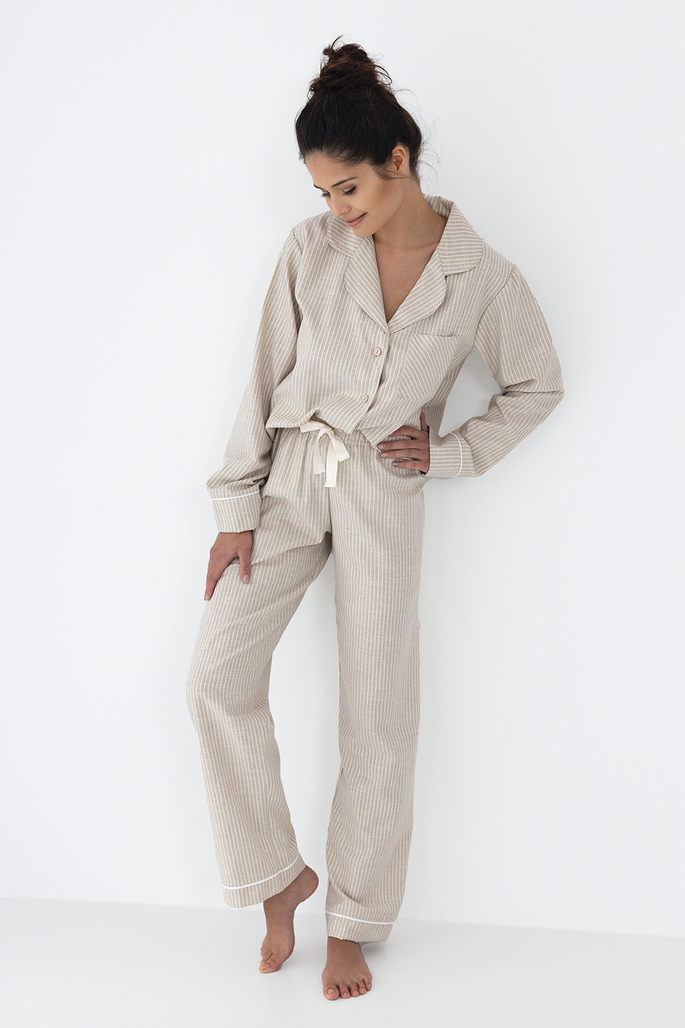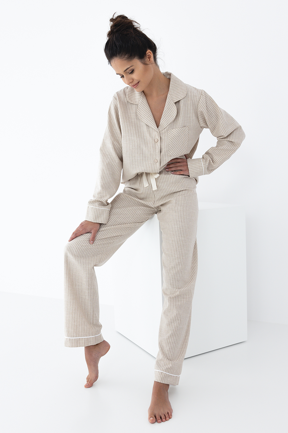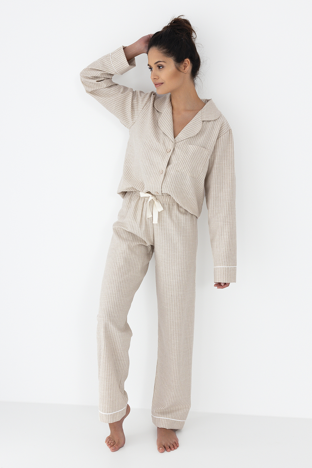 Пижама Lupita состоит из рубашки и брюк. Рубашка с фигурным воротом. Брюки прямого кроя и на широкой резинке. Идеальный вариант не только для сна, но и для домашнего отдыха.
