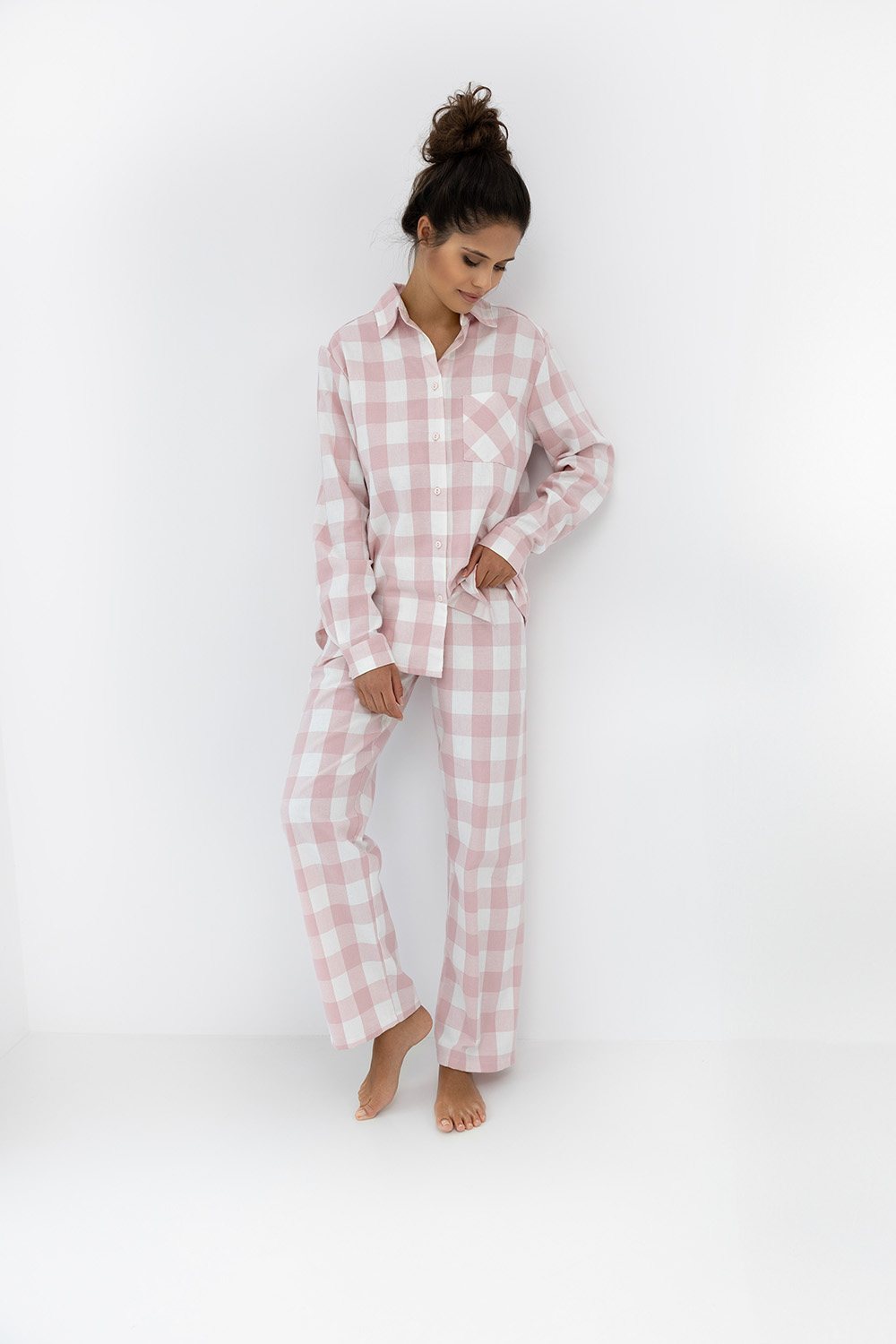 Стильный домашний комплект Marley в крупную клетку состоит из рубашки на пуговицах и прямых брюк. Рукава оформлены манжетами. Идеальный вариант не только для сна, но и для домашнего отдыха.
