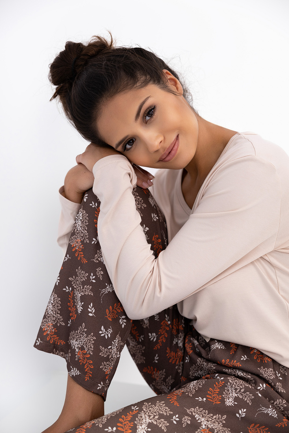 Повседневная пижама Shelby с прямыми брюками и однотонным лонгсливом. Лонгслив с v-образным вырезом и с длинными рукавами. Брюки с растительным принтом принтом и контрастным бантиком на поясе. Идеальный вариант не только для сна, но и для домашнего отдыха. Состав брюк: вискоза 100%.