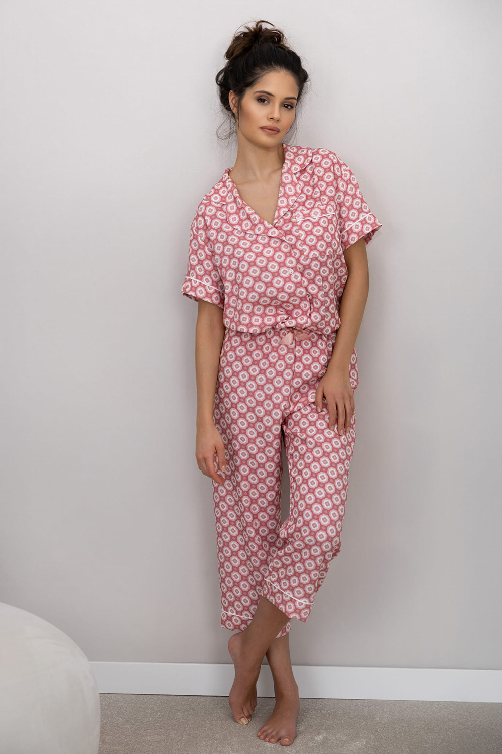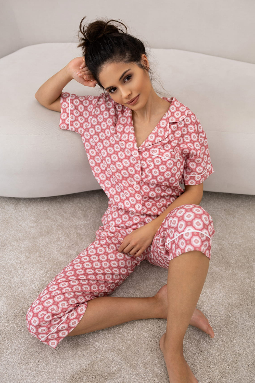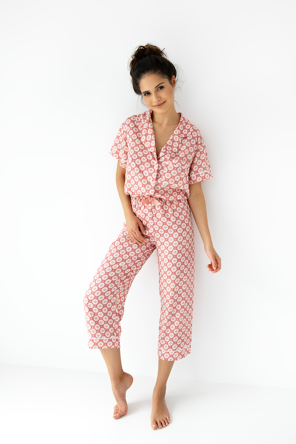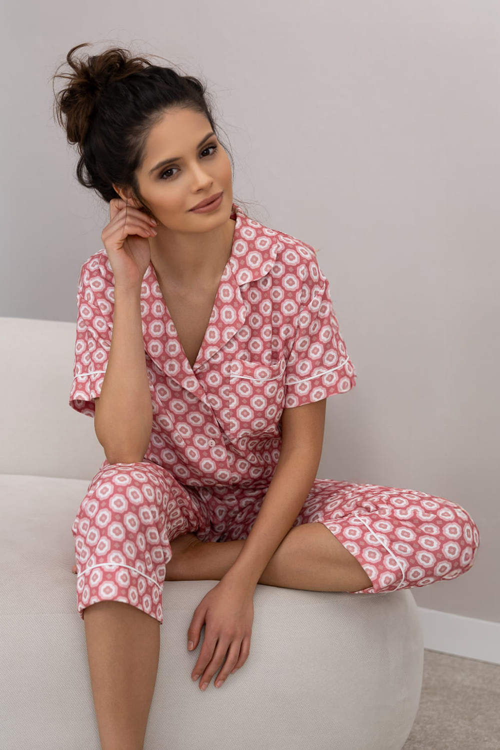 Пижама Sofija с принтом состоит из рубашки и прямых брюк. Рубашка с коротким рукавом и кармашком на груди. Брюки укороченные, с атласным бантиком на поясе. Идеальный вариант не только для сна, но и для домашнего отдыха.