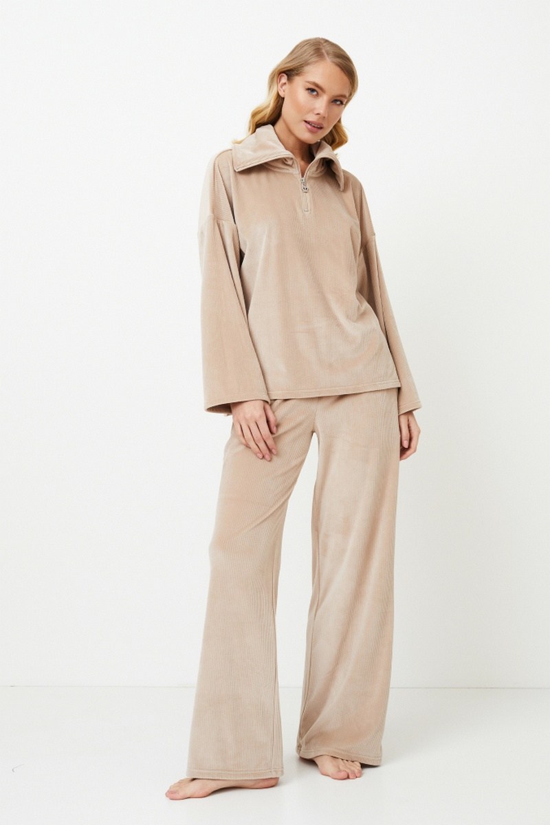 Представляем комплект Quinn, в котором комфорт сочетается с королевским стилем! В топе с длинными рукавами, уникальной застежкой-молнией в форме короны и уютным высоким воротником вы почувствуете себя королевой, отдыхающей дома. Широкие брюки обеспечивают свободу движений и удобство благодаря карманам для предметов первой необходимости. Выполненный в бежевом цвете, этот комплект излучает неподвластную времени элегантность. Побалуйте себя набором Quinn и насладитесь комфортом и стилем! Материал велсофт в рубчик.