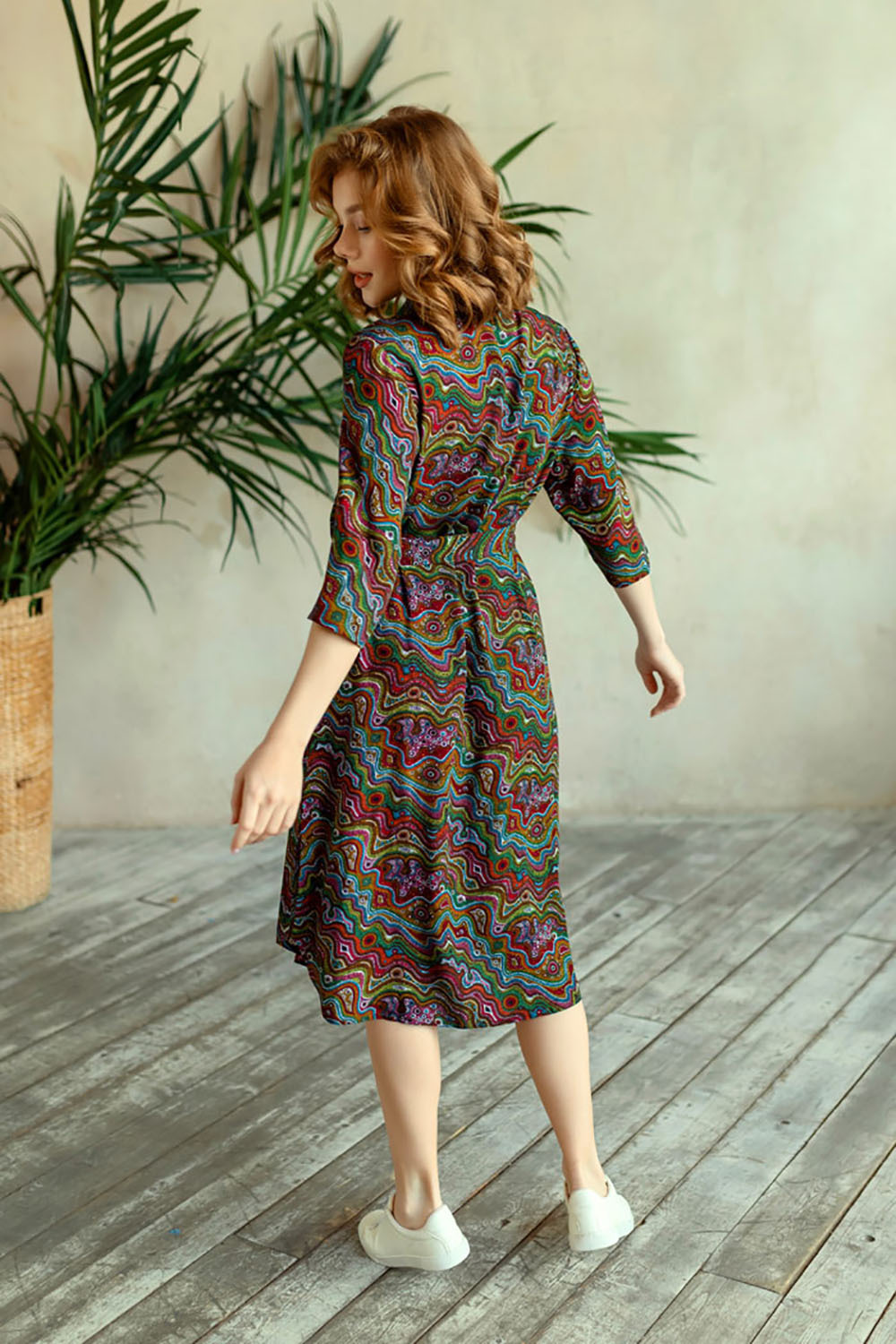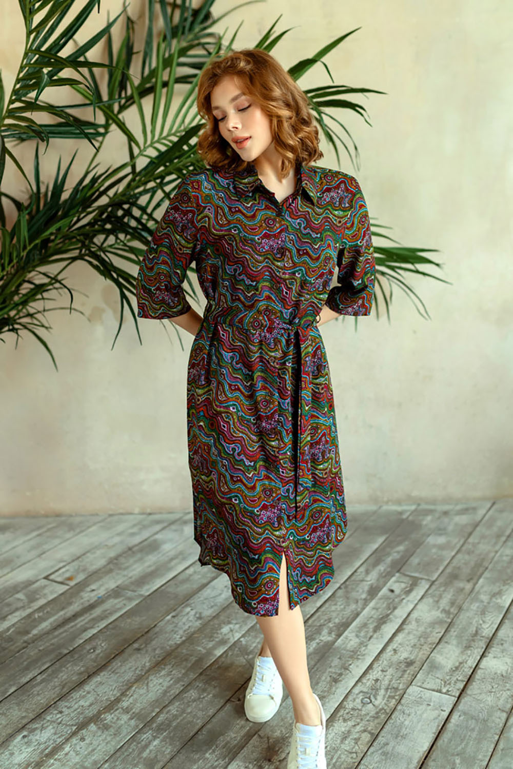 Туника домашяя женская выполненная из принтованной вискозы. Модель на поясе свободного силуэта длины миди. Туника рубашечного типа с воротником стойкой и планкой застежкой на пуговицах. Рукав прямой длиной 3/4.