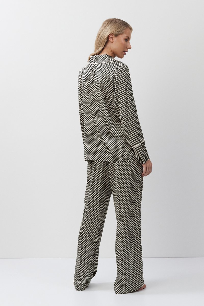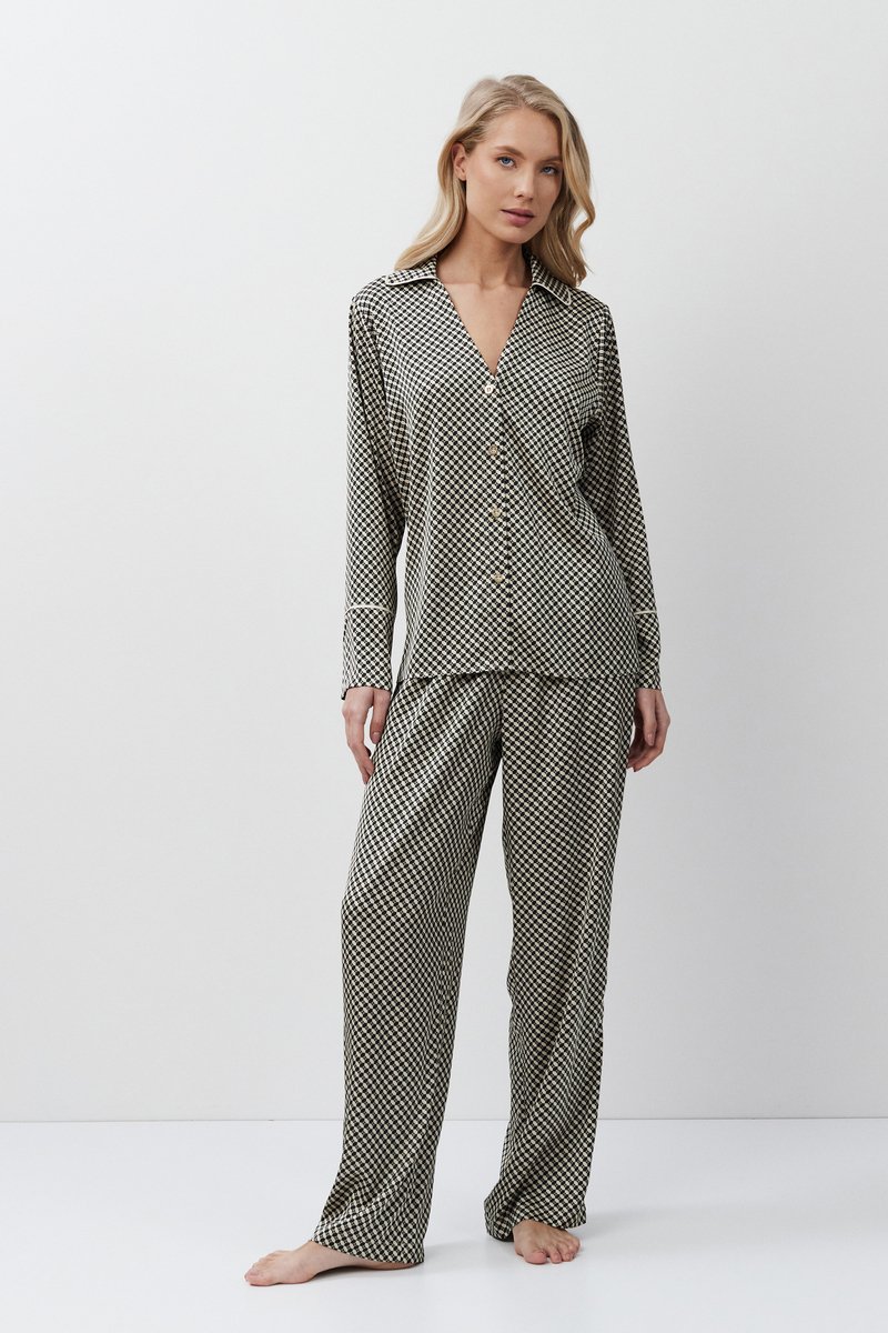 Пижама женская со штанами ROMIE для максимального комфорта и расслабления. Выполнена из приятной к телу легкой шелковистой ткани. Рубашка на пуговицах, с отложным воротником и V-образным вырезом. Рукава длинные, с окантовкой. Штаны длинные, свободные, с комфортной посадкой, эластичный пояс со шнурком. Пижама станет вашим идеальным спутником во время сна.