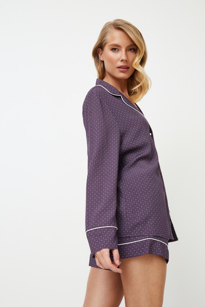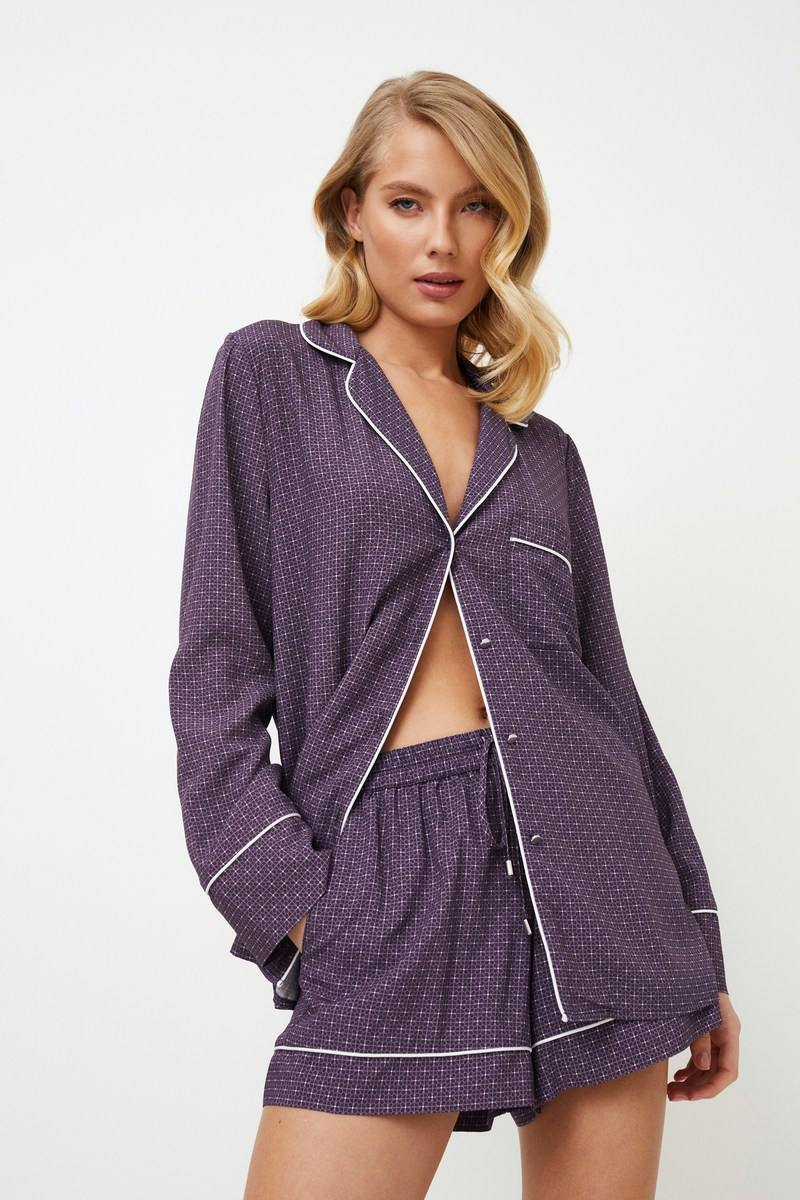 Представляем короткую пижаму Sabine - в каждом шве чувствуется нотка королевского удовольствия. Эта рубашка с длинными рукавами, V-образным вырезом горловины, нагрудным карманом и элегантными манжетами на рукавах, украшенными белой окантовкой, придаст вам комфорт. В сочетании с широкими шортами с удобными карманами и окантовкой по низу. Шорты дополнены поясом-шнурком с металлической деталью. Пижамный комплект из вискозы королевского фиолетового цвета с геометрическим рисунком. Почувствуйте королевский комфорт в короткой пижаме Sabine.