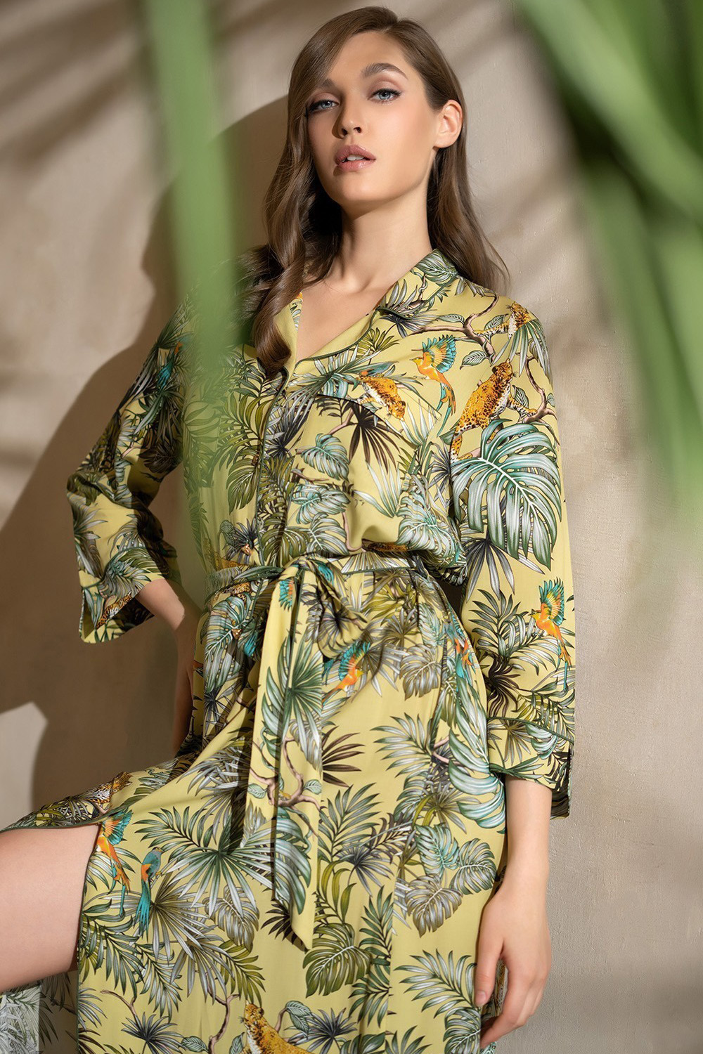Длинная рубашка Mia-Amore с рукавом 3/4 рукавом, выполнена из принтованной вискозы с отделкой в виде контрастных кантов. Рубашка с застежкой на эффектные золотые пуговицы в виде леопардовых голов. На верхней части полочек изделия расположены накладные карманы с клапанами, также обработаны дополнительные карманы в боковых швах. Линию талии можно подчеркнуть за счет пояса, который идет в комплекте. Разрезы по низу изделия обеспечивают дополнительную свободу движения.