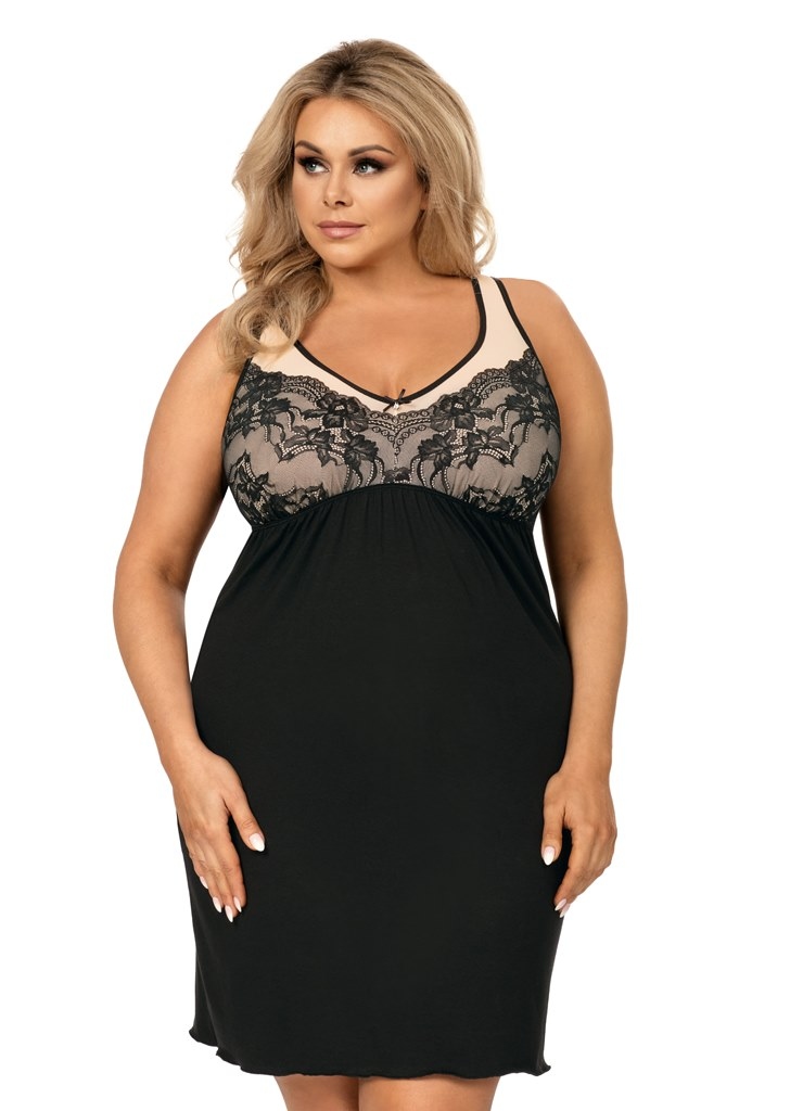 Сорочка женская SARAH plus от европейского производителя Donna. Модель с кружевным верхом на широких лямках. Изделие упаковано в коробку с изображением модели.