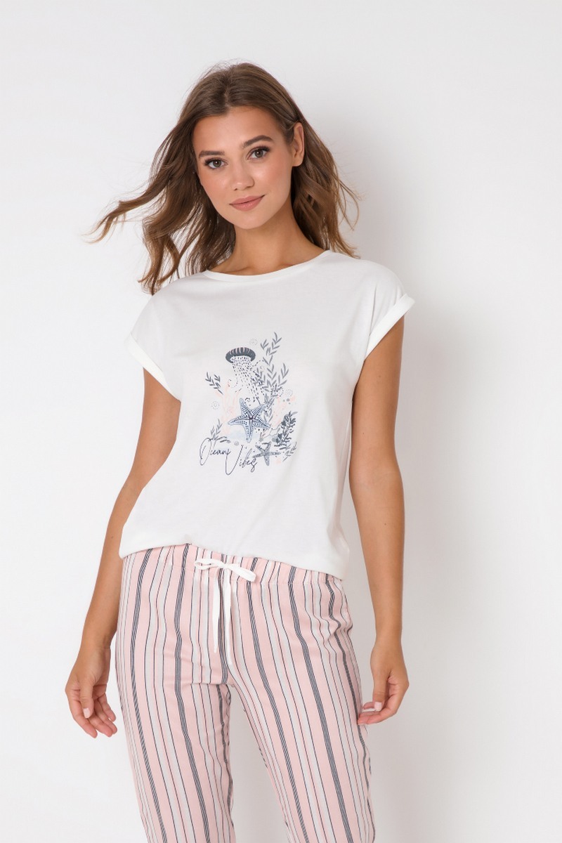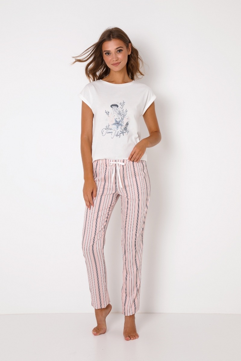 Океанские флюиды! Длинная пижама Scarlette станет приятным дополнением к вашей коллекции пижам, если вы любитель моря. Верх выполнен из мягкой хлопчатобумажной ткани, а низ - из тканой саржевой вискозы с рисунком в полоску. Рукава имеют загнутый вид, талия завязана дополнительным функциональным поясным шнурком.