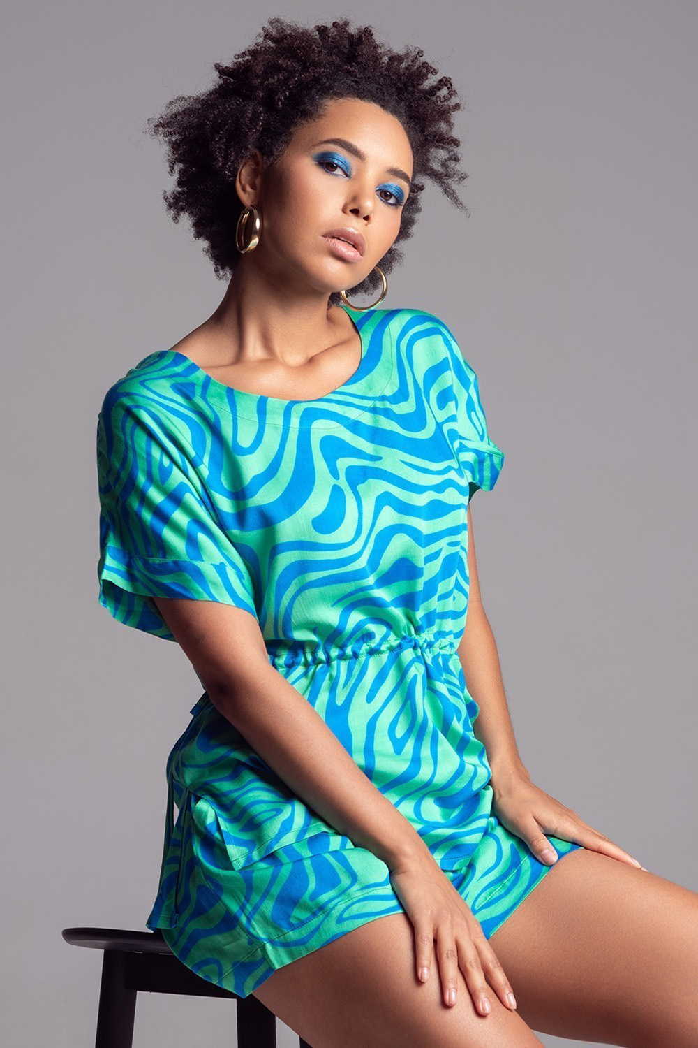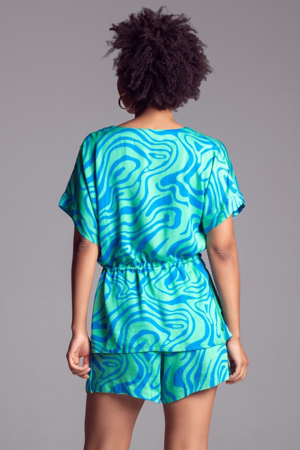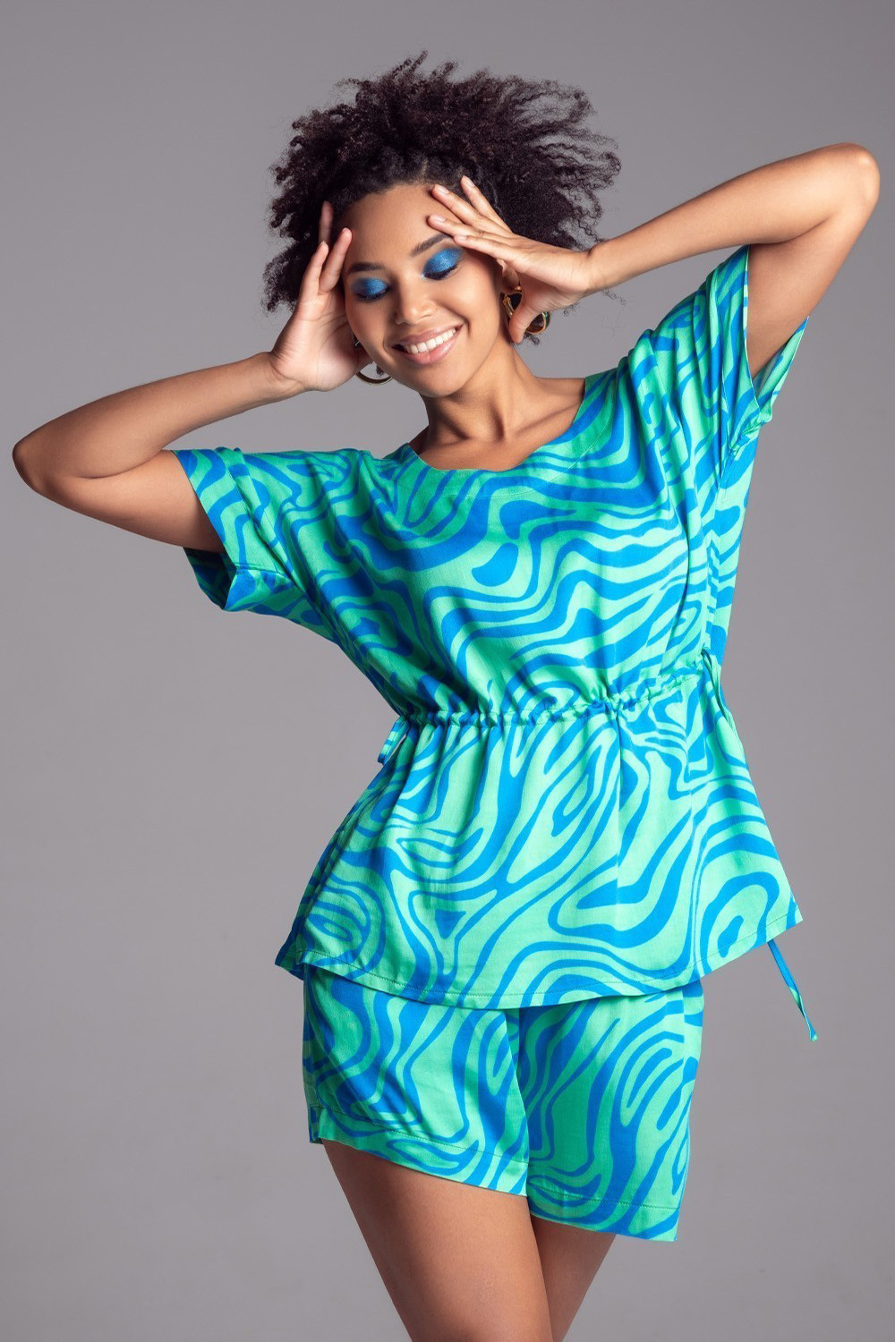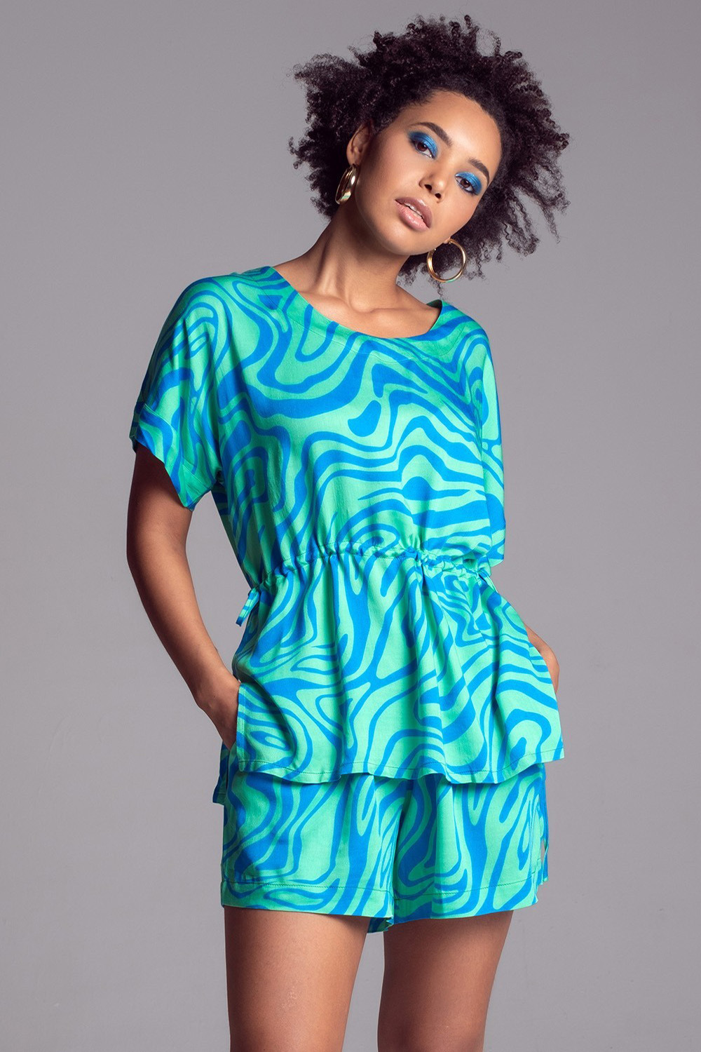 Комплект топ и шорты Mia-Amore выполнен из принтованного вискозного полотна. Топ с цельнокроенными короткими рукавами и регулируемой кулиской по талии. Низ рукавов топа оформлен узкой манжетой и декоративной патой на пуговице. Шорты с поясом на резинке свободного силуэта и карманами.