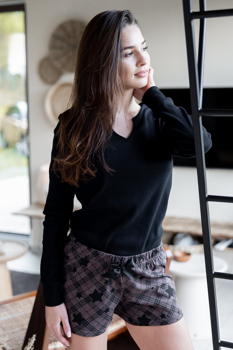 Пижама SHE от европейского производителя Sensis. Однотонная кофта с v-образным горлом. Шорты приталенного кроя с атласным бантиком на поясе. Принт шорт в россыпь звезд.