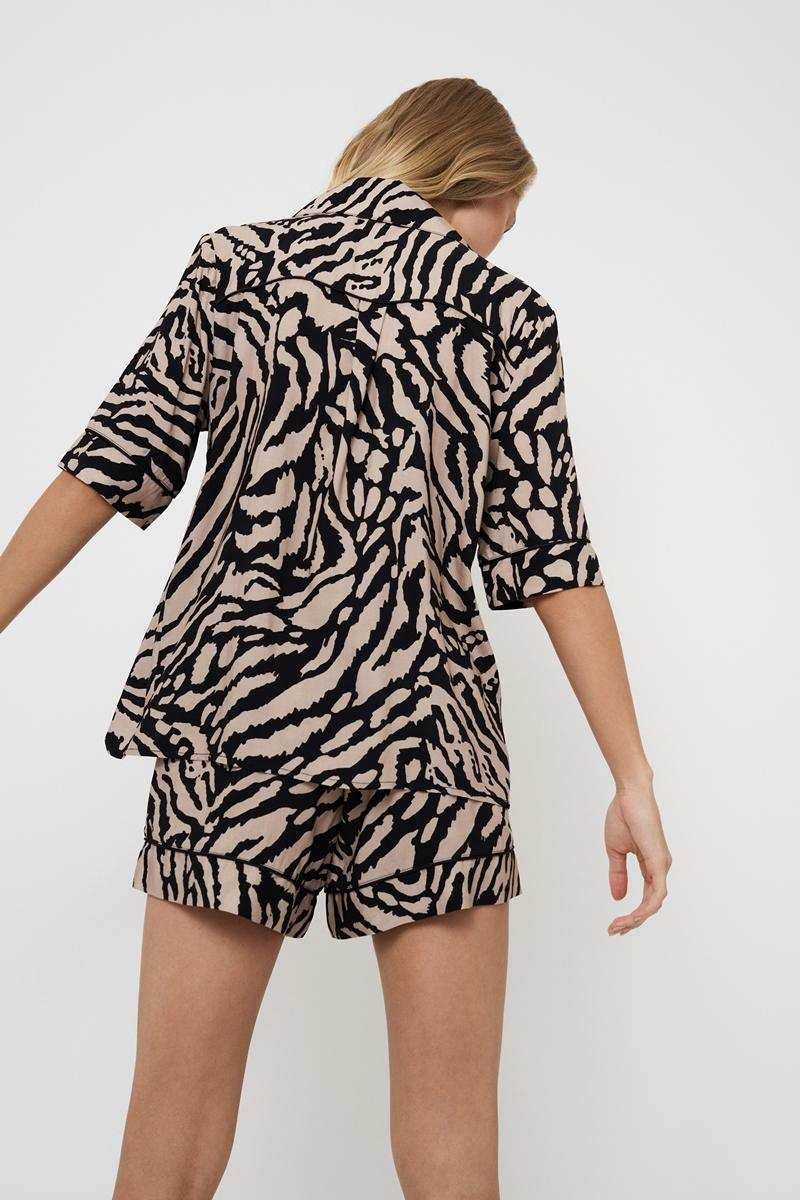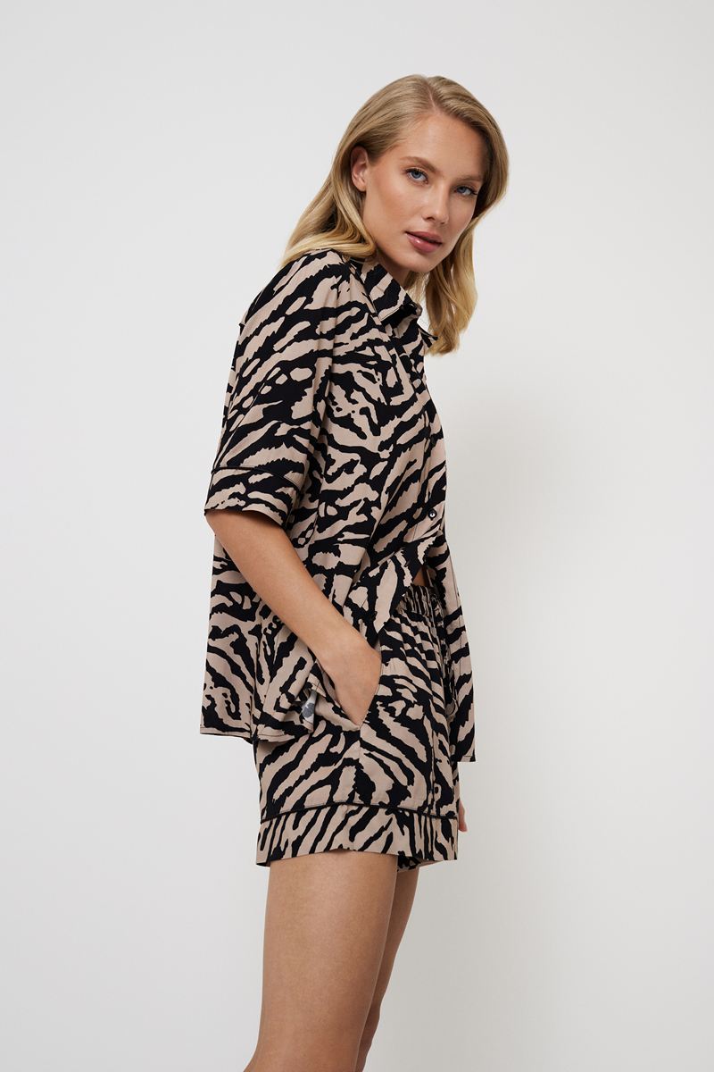 Представляем вам пижамный комплект Sherry — потрясающее сочетание комфорта и стиля. Выполнен из лёгкой вискозы с неподвластным времени бежево-чёрным принтом в виде животных. Рубашка на пуговицах с рукавами до локтя, где обычный воротник, изысканная чёрная окантовка вдоль кокетки, строчки и манжет рукавов придают утончённую элегантность. Широкие шорты с эластичным поясом и регулируемым бантом на талии обеспечивают идеальную посадку. Чёрная окантовка вдоль швов на манжетах и карманов, излучает смелость от макушки до пят. Погрузитесь в элегантную атмосферу в пижаме Sherry, где комфорт идеально сочетается с шикарным стилем.