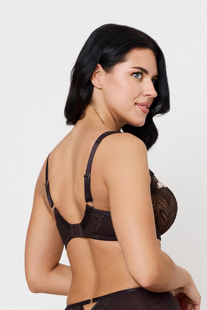 Бюстгальтер SILVIA CHOCO от европейского производителя Subtille. Мягкая чашка на кости, несъемные регулируемые бретели. Конструкция S-03 каплевидной формы, хорошо закрывает грудь сверху. Выполнен из нежной сеточки с вышивкой.