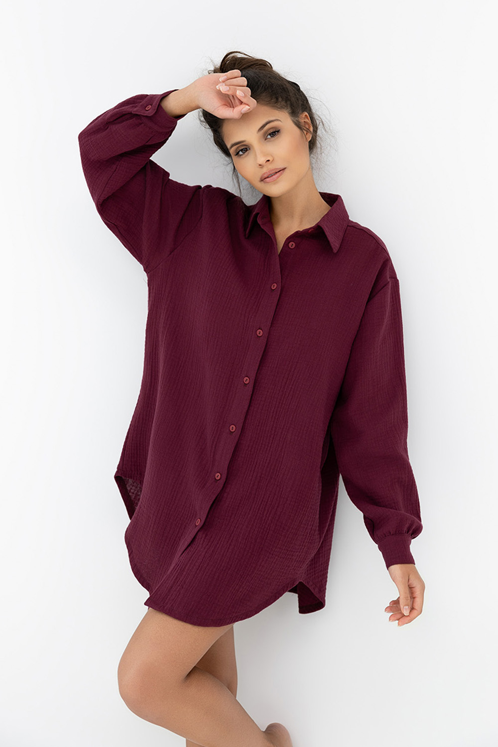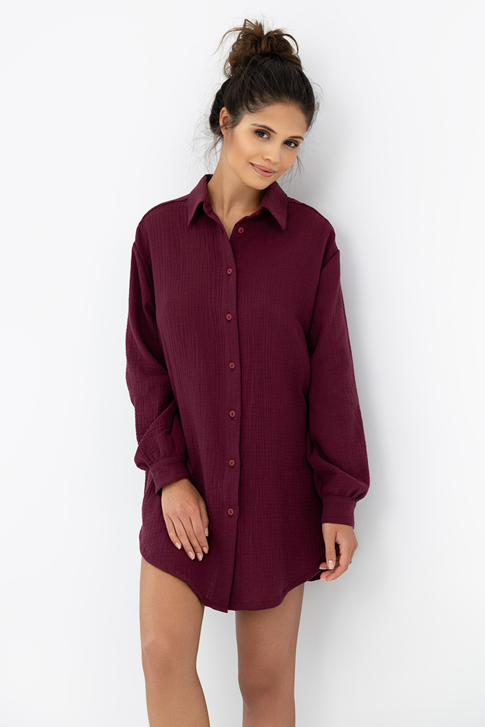 Короткая сорочка рубашечного типа Ivory необычного винного оттенка. Изделие на пуговицах, с фигурным воротником. Рукава оформлены манжетами. Идеально подойдет не только для сна, но и для отдыха в домашней обстановке.